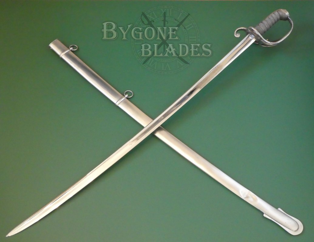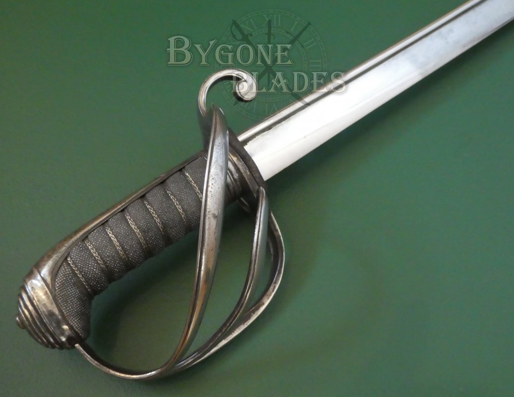 The steel three-bar cavalry guard is in excellent condition with minimal wear and marks from use. The plain steel back strap, with slightly raised, lozenge shaped thumb section is finished with a stepped oval pommel and peened tang.