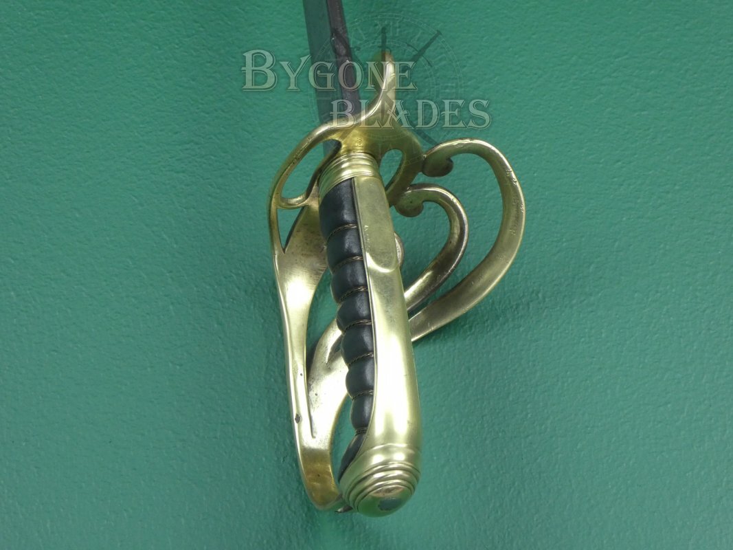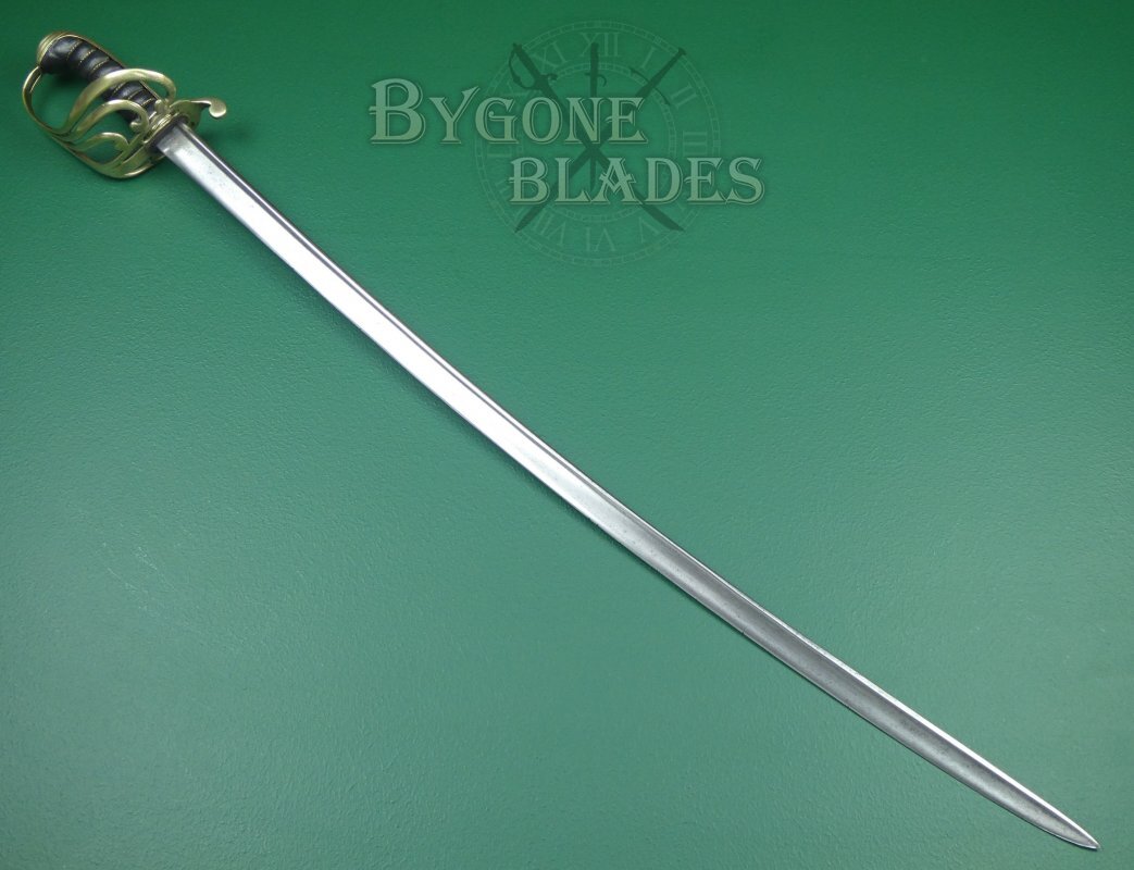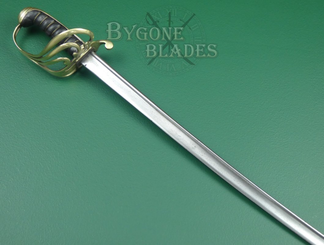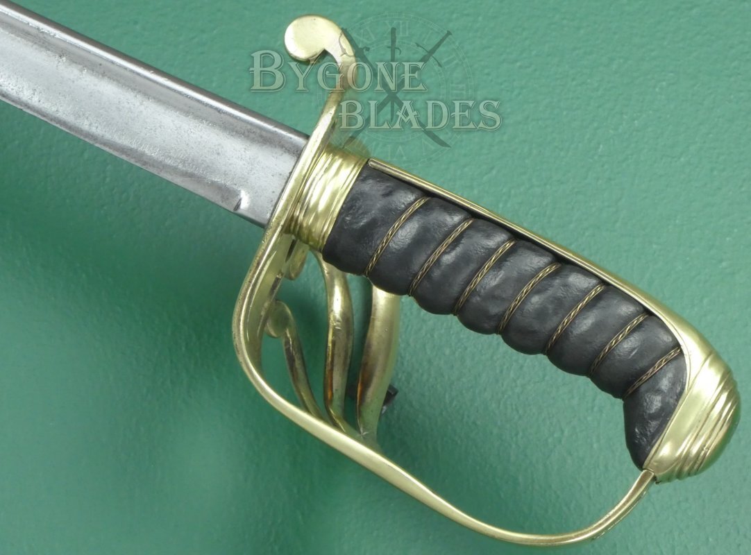 This scarce quill-pointed, brass hilted sword is very similar to the regulation pattern 1821 for British Light Cavalry officers. The same pattern was adopted by the Royal Horse Artillery. This sword however has a non-regulation brass 3-bar guard. This could indicate that it was for an officer of a British Indian army regiment or a yeomanry officer.