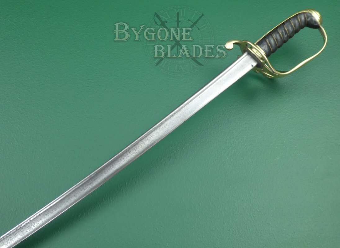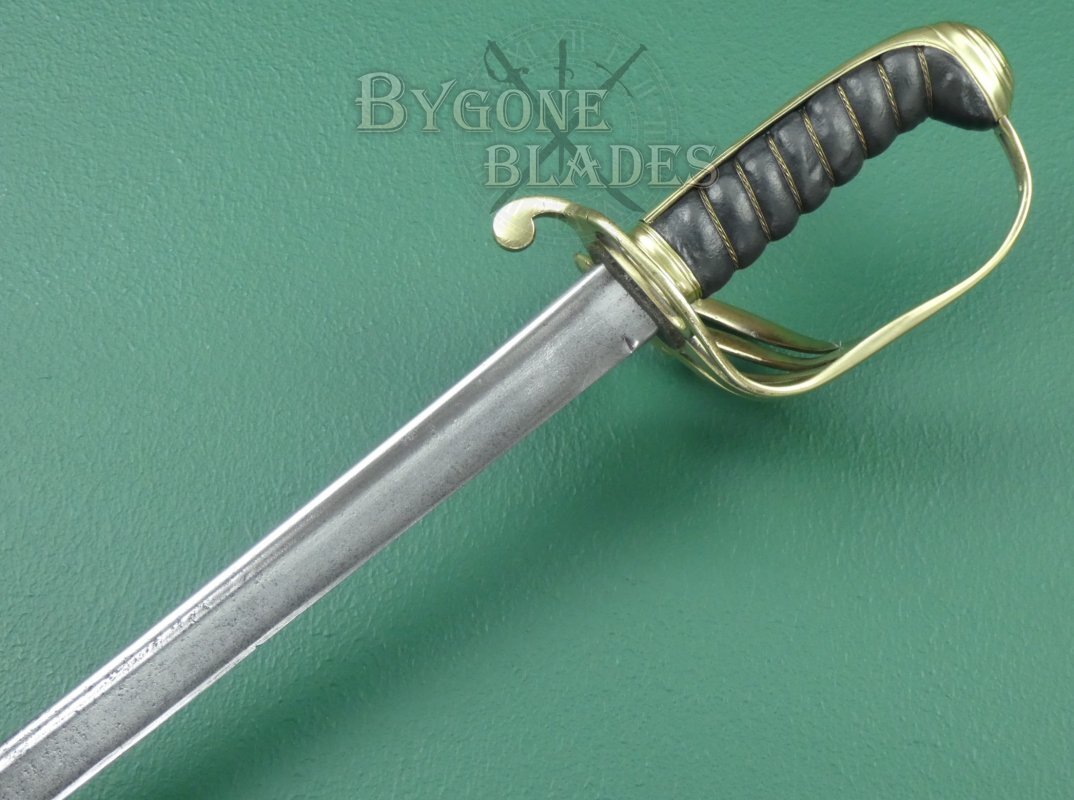 This is a very nice example of a scarce, early 1821 quill-pointed sword with an 1821 light cavalry style brass guard.