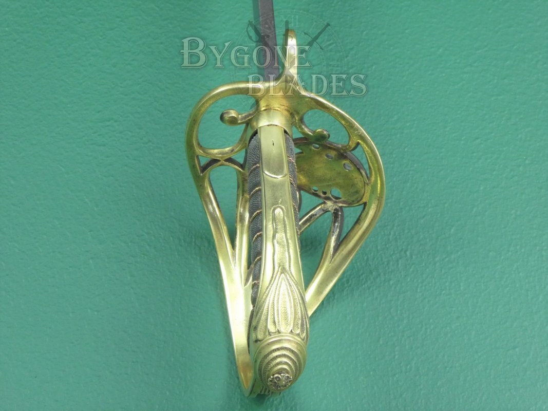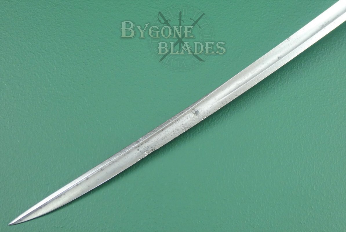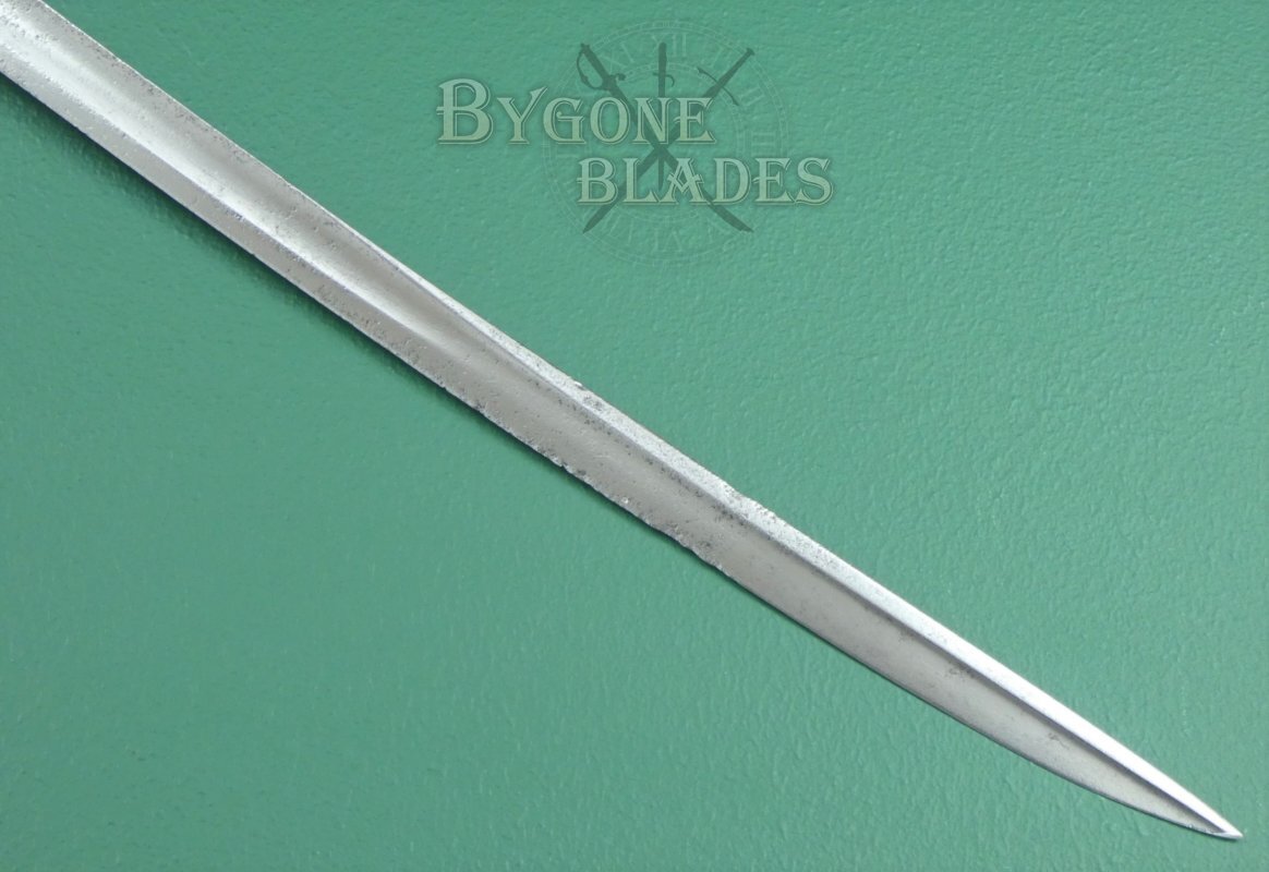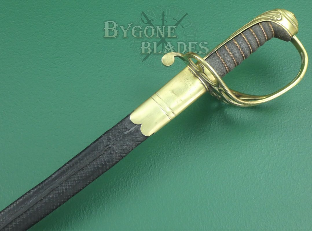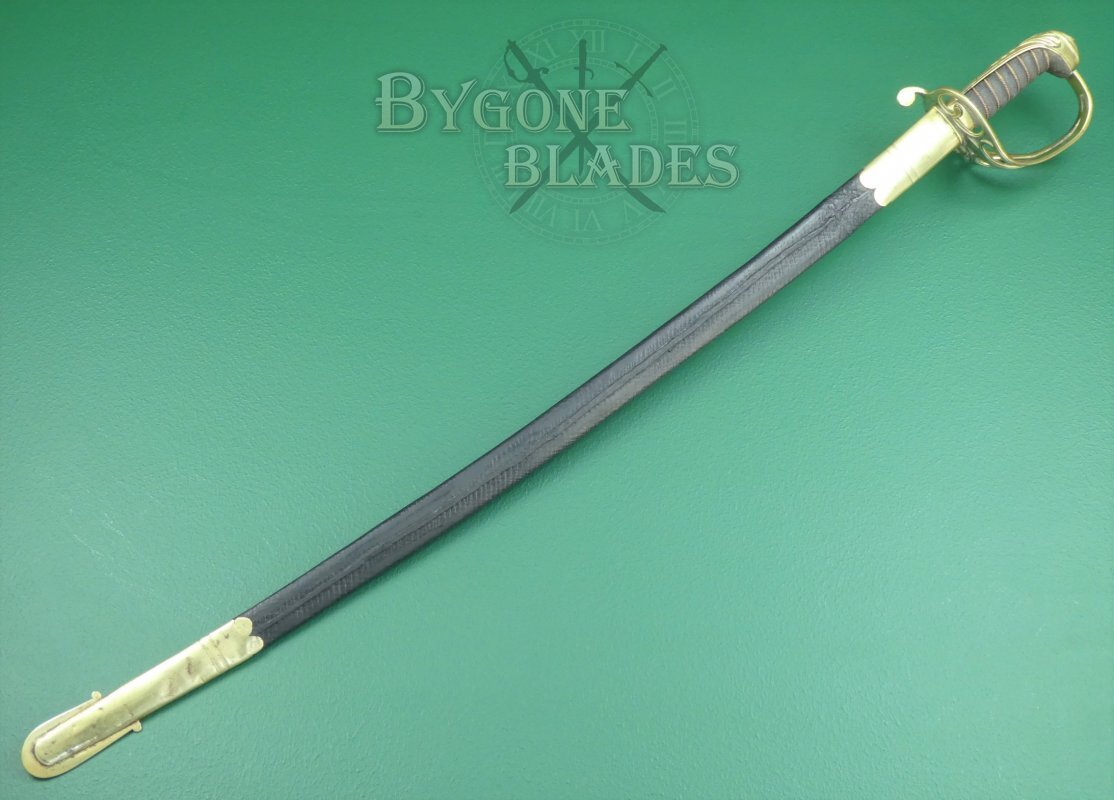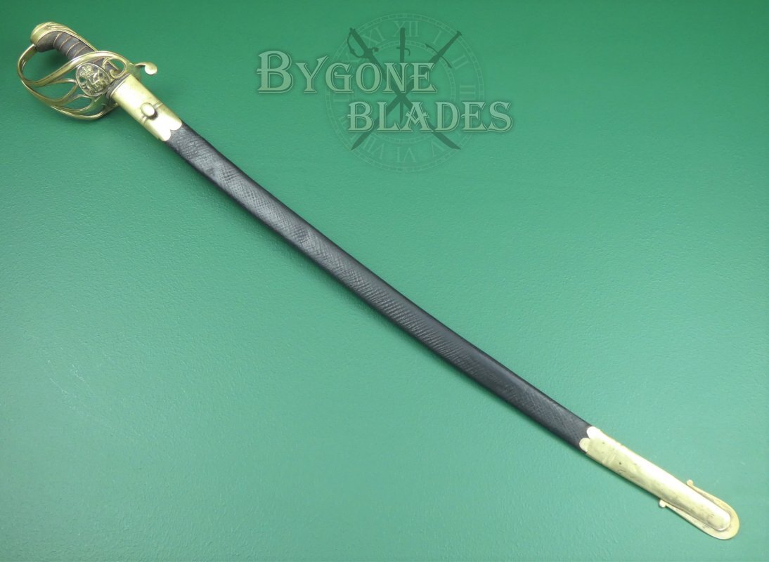 The sword is complete with its leather scabbard with brass fittings. The locket has an oval frog stud. The leather is in good condition, with age appropriate wear and marks. There is an old repair below the locket which is all but unnoticeable. The stitching is intact. The sword sheathes and draws smoothly and is held firmly within the scabbard.