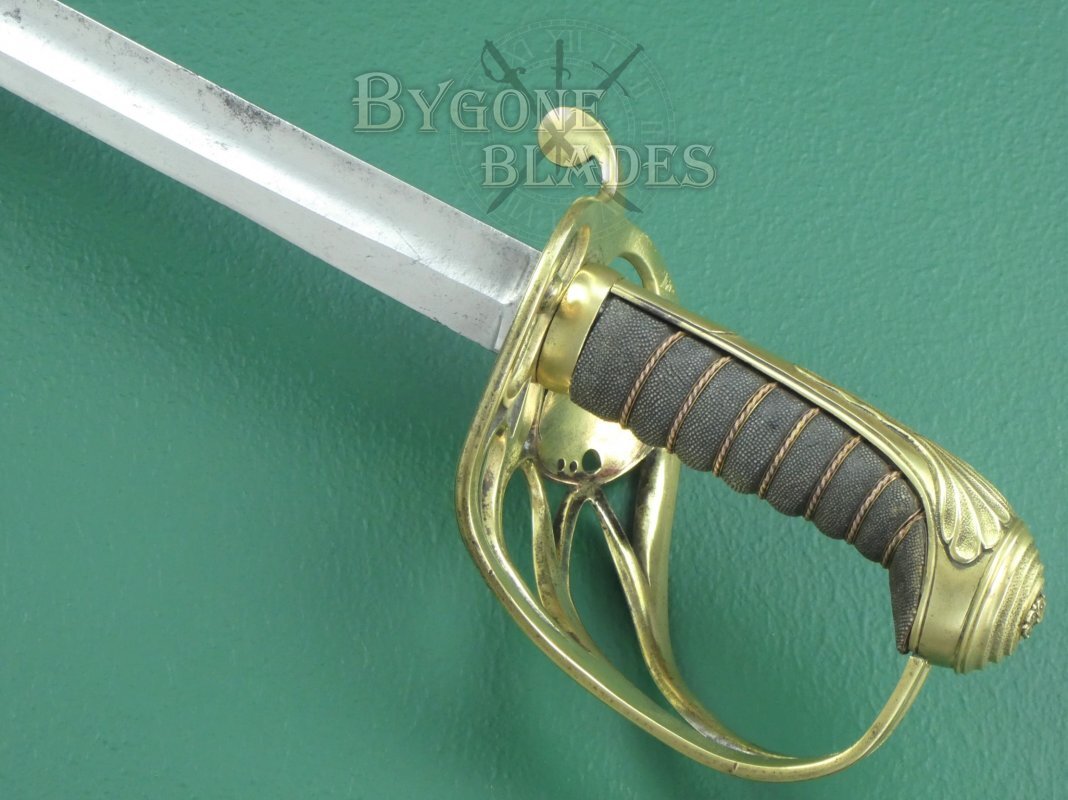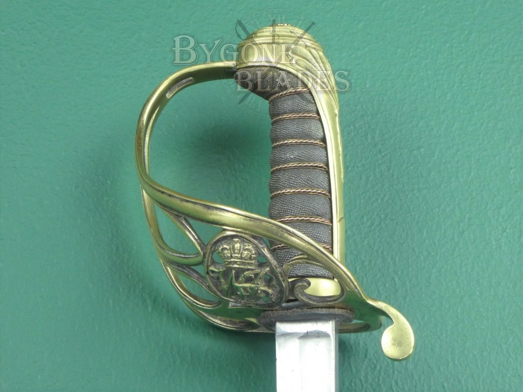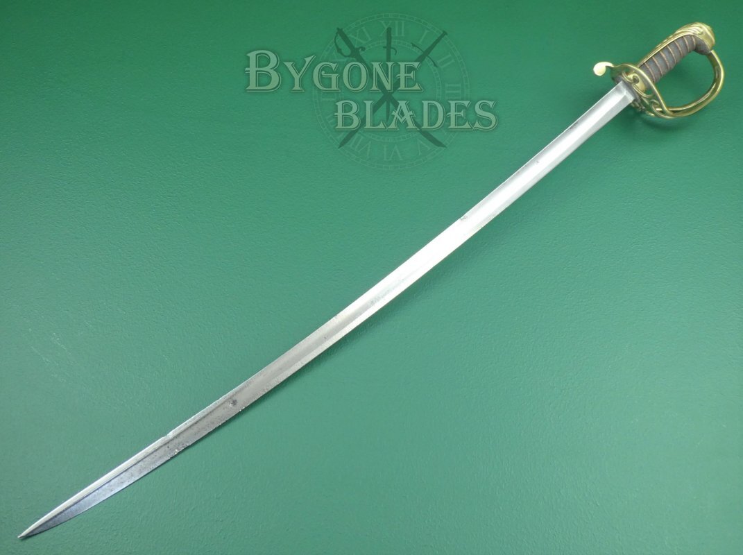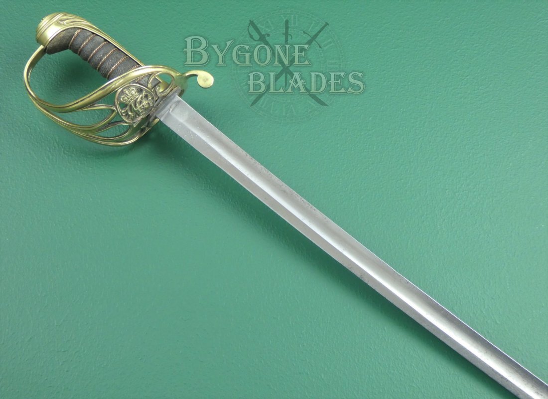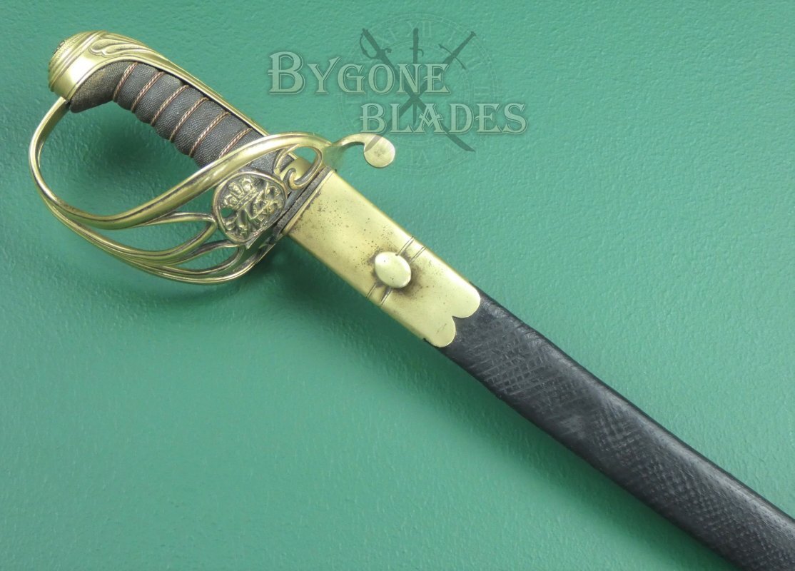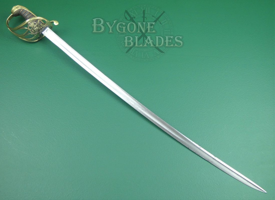 The Gothic brass guard is fixed (unlike the officer’s variant) and bears an oval cartouche containing King William IV (1830-1837) Royal cypher. The guard is in good condition. The shagreen grip is in good condition with its copper wire intact and tight. The hilt’s back strap has acanthus style decoration flowing into the stepped oval pommel. The pommel is finished with a flower head tang button. The blade is firm in the hilt.