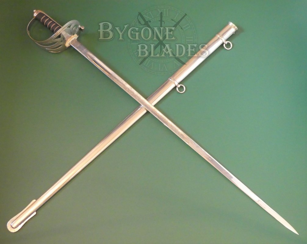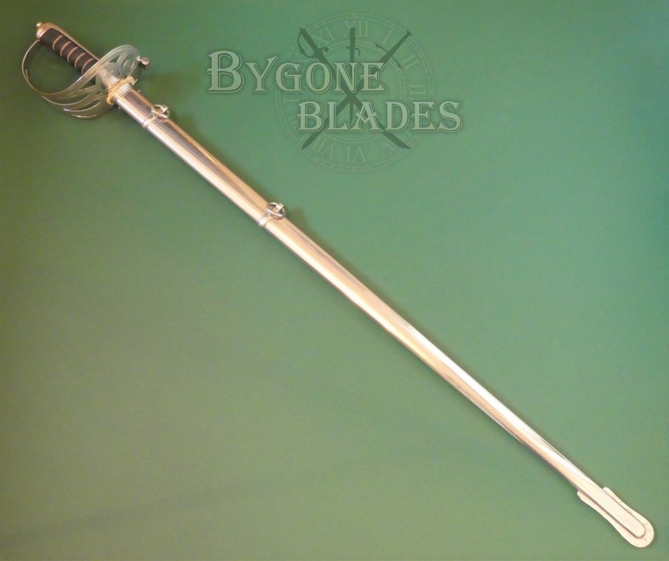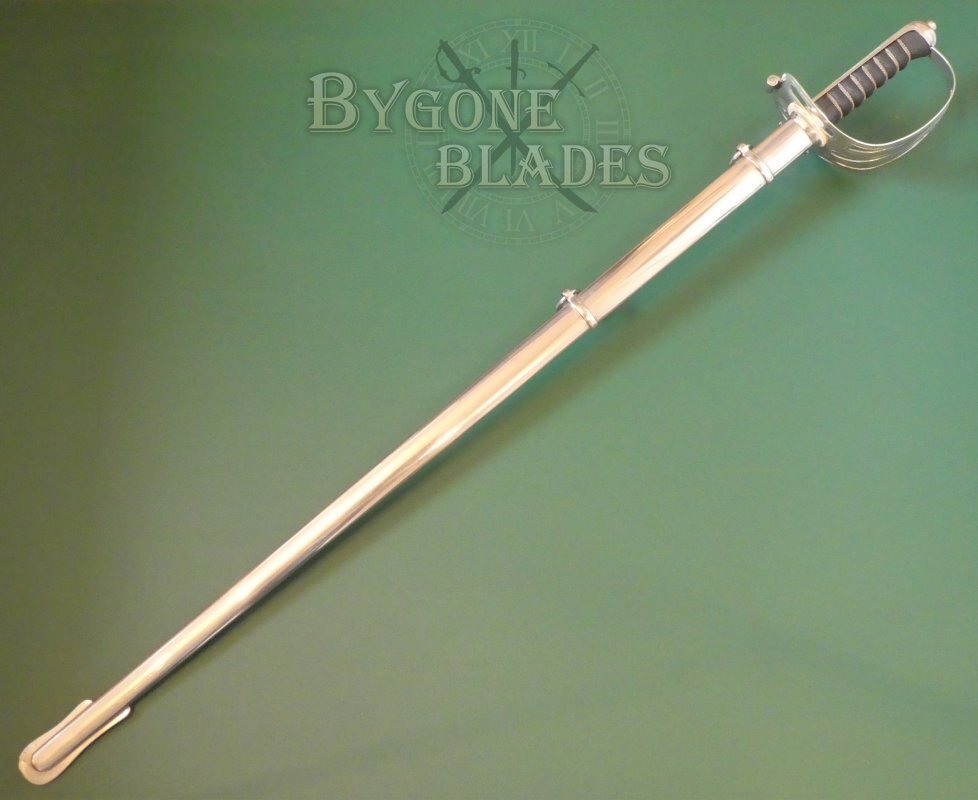 The plated steel scabbard with two suspension rings is in near mint condition. The sword sheathes and draws smoothly and is held firmly within the scabbard.