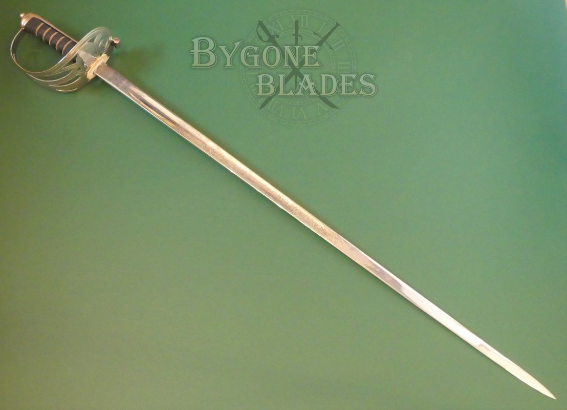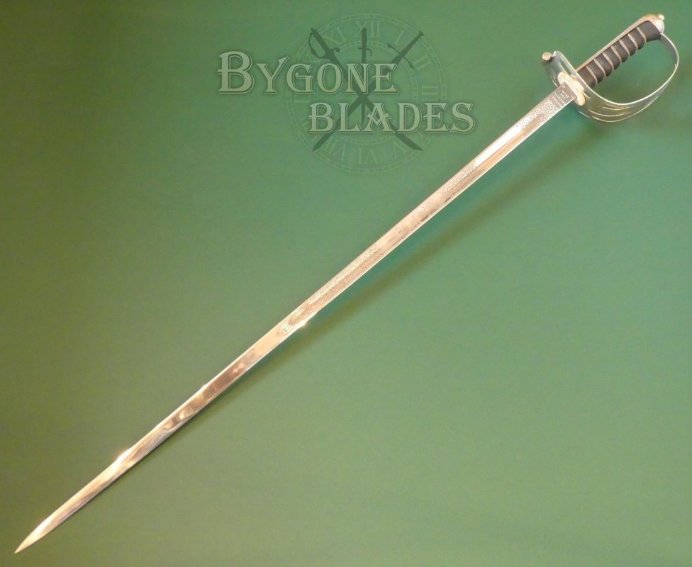 The 825mm thrusting blade is of dumbbell form, the first third of the blade having a symmetrical dumbbell-like cross section with a flat spine and belly and a short central fuller. The blade has a wedge shaped cross section for the last two-thirds of its length and terminates in a narrow spear point. The 1892 blade is the ultimate thrusting design. The blade is in fantastic, near mint condition.