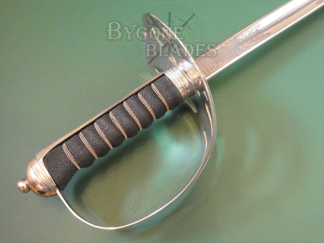 The blade is deeply and crisply etched with foliate scrollwork and King George V crowned royal cipher above the Rifle Brigade’s horn and ribbon. The obverse bears foliate scrollwork, a rayed crown and the badge and motto of the Ceylon Planters' Rifle Corps with their motto, Unitas Salus Nostra, (Safety in Unity). The ricasso is etched with the maker’s details, “Henry Wilkinson, Pall Mall. London” below the Royal Warrant.