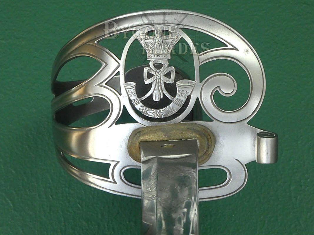 The Gothic steel guard is in very good condition. The guard incorporates an oval cartouche containing the crowned, strung horn badge of the Rifle Regiment. The smooth back strap has a knurled thumb rest and ends in a stepped oval pommel and tang button. The shagreen grip is in good condition and the three strands of wire are intact and tight. The blade is firm in the hilt.
