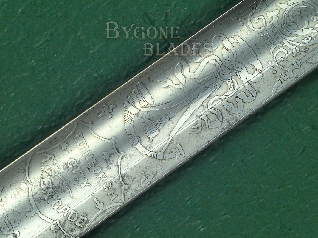 The blade is etched with the Rifle Brigade’s strung horn above a shield bearing the legend “Edinburgh City R. V. Brigade.” The forte bears the owner’s initials enabling identification of the officer.