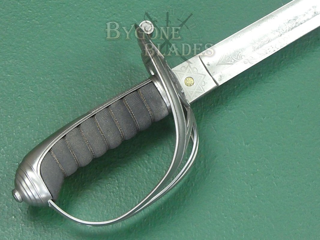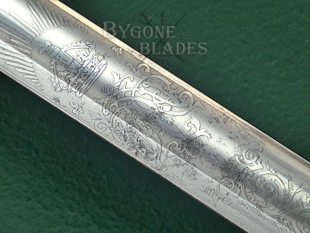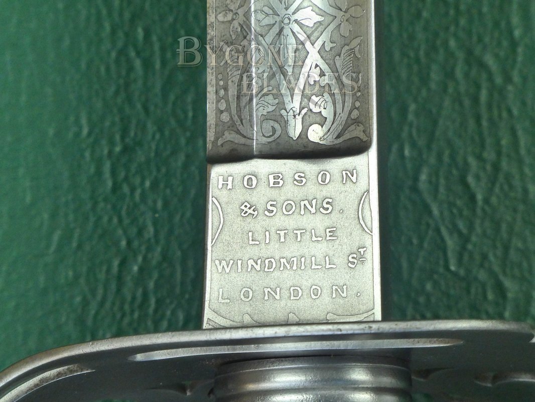 The obverse of the blade has Queen Victoria’s crowned royal cipher amidst foliate scrollwork panels. The ricasso is etched with the retailer’s details, Hobson & Sons, Little Windmill Street, London. The obverse ricasso bears a Pillin family proof stud.