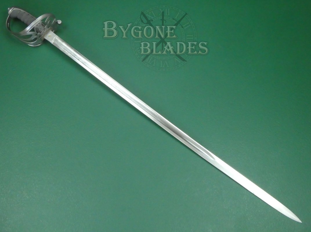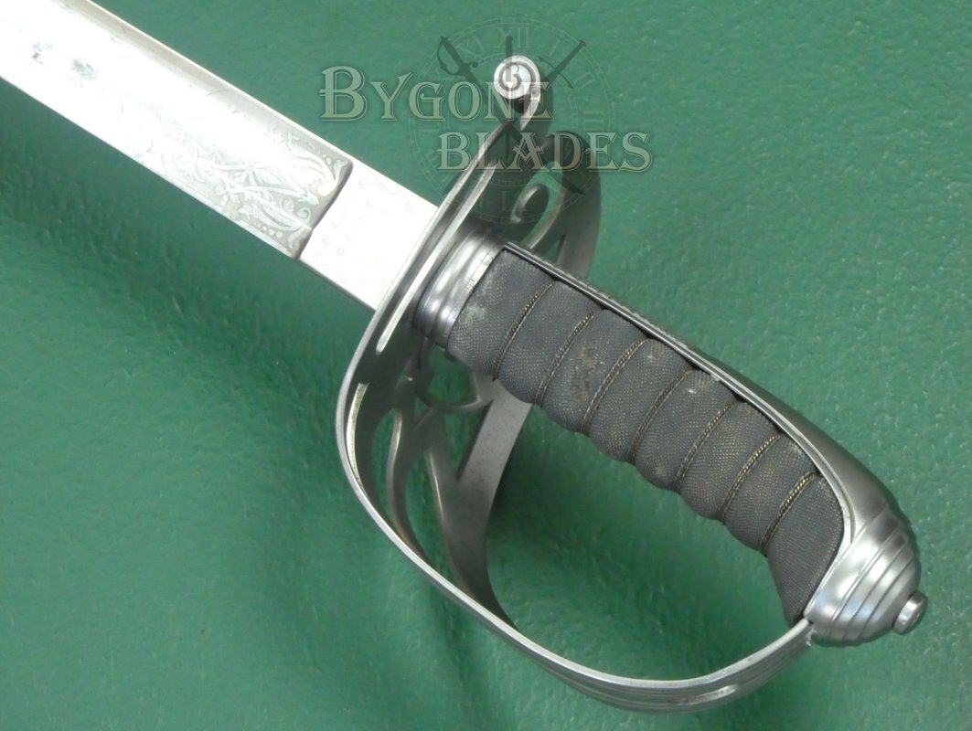 The 875mm single-edged blade is of the 1845 “Wilkinson” pattern. The blade has a flat spine above a broad single fuller and tapers to a double-edged spear point. The blade is in very good condition with minimal age and use related marks.