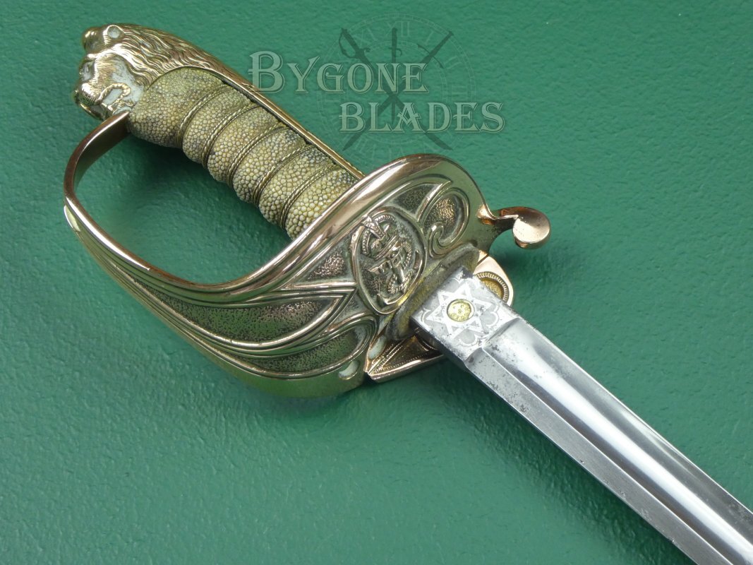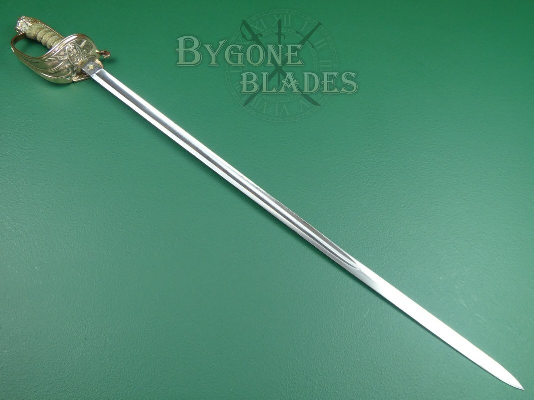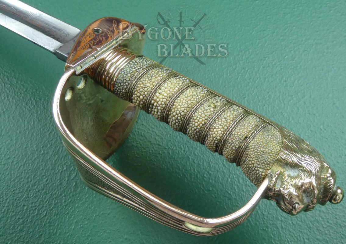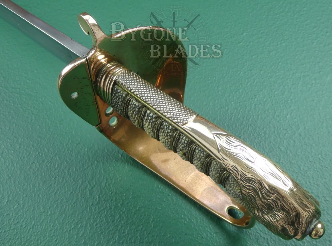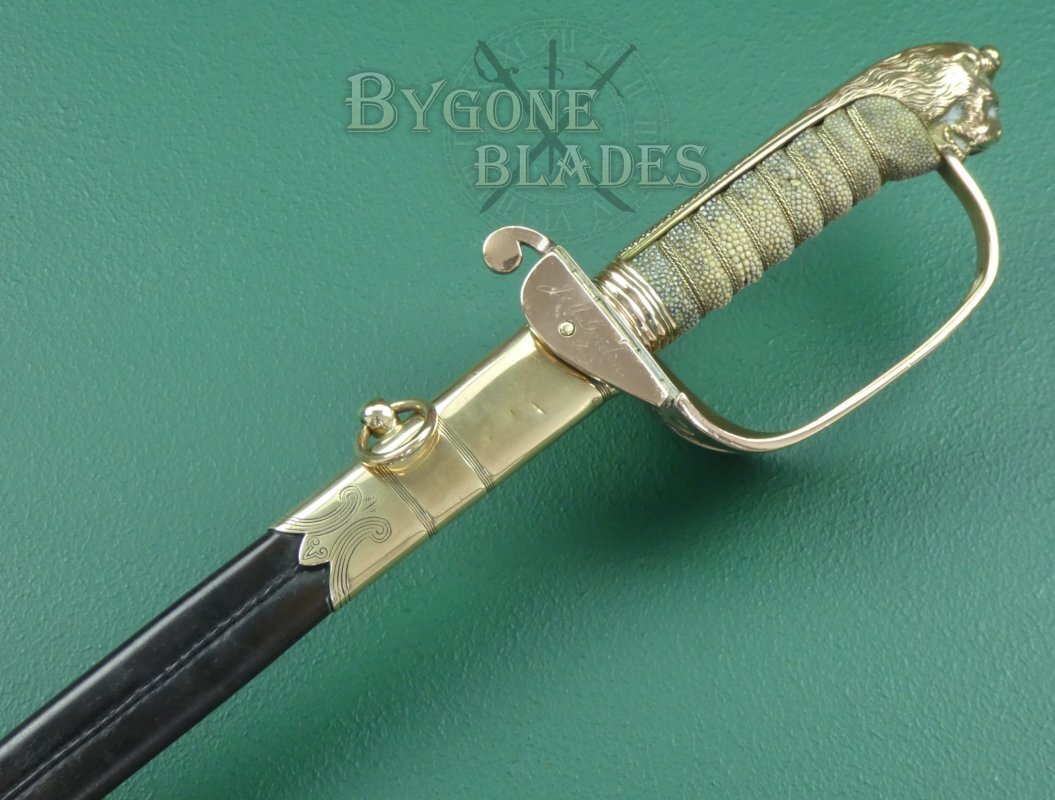 The mane of the highly detailed lion head pommel extends for only a third of the length of the back strap. The forward half of the back strap has a knurled thumb rest. The short mane and knurled thumb rest are features usually associated with earlier Royal Navy sword hilts. The “D” guard extends from below the lion’s chin. The shagreen grip is of top quality and in great condition with some age related staining. The twisted gilt wire wrap is present and in excellent condition.