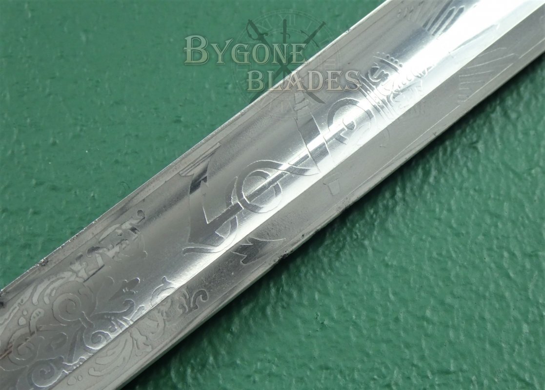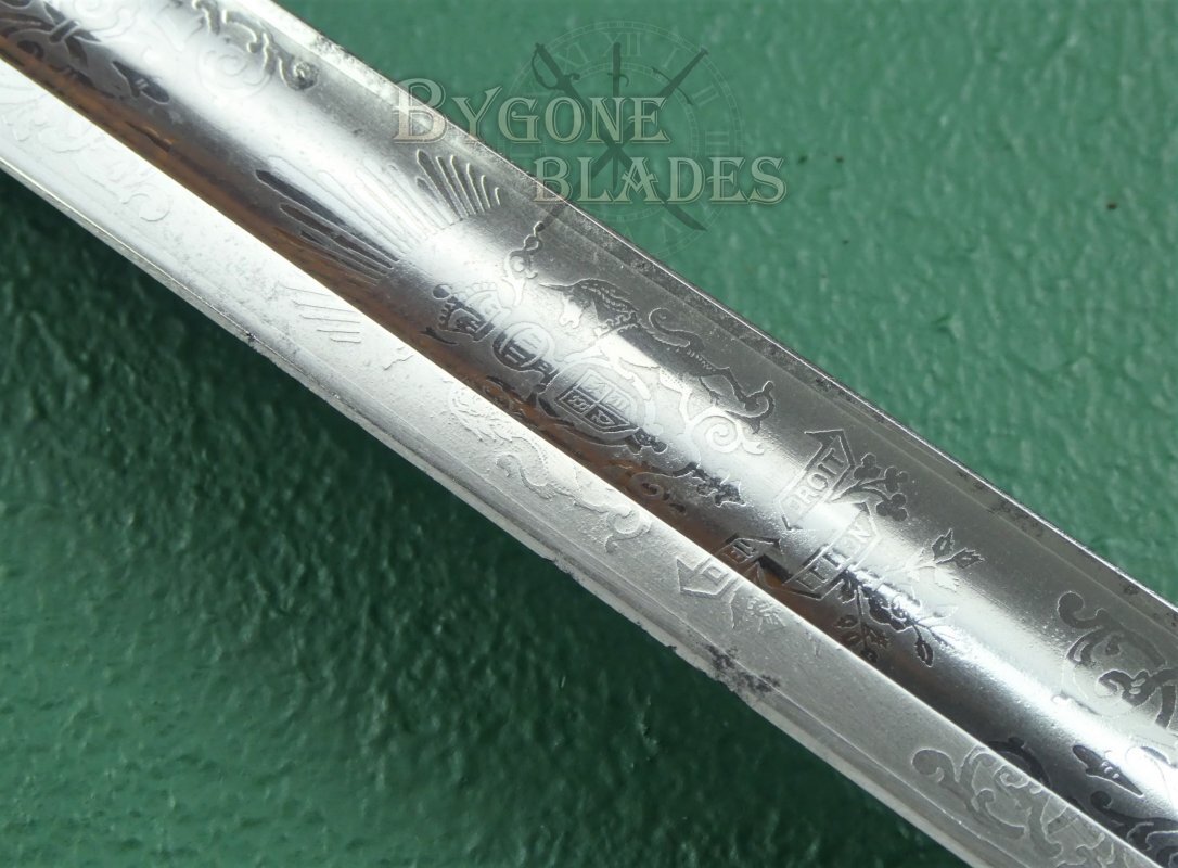 The blade is etched with a Tudor crown and the Royal Navy fouled anchor motif between arched foliate scrollwork. The obverse of the blade bears the Royal Arms depicting a lion and unicorn rampant and the motto “Dieu et Mon Droit” above the Flowers of the Union. The forte of the obverse of the blade is also etched with the Royal Arms. The blade is clean and bright and in very good condition with some small, isolated spots of pale tarnish.