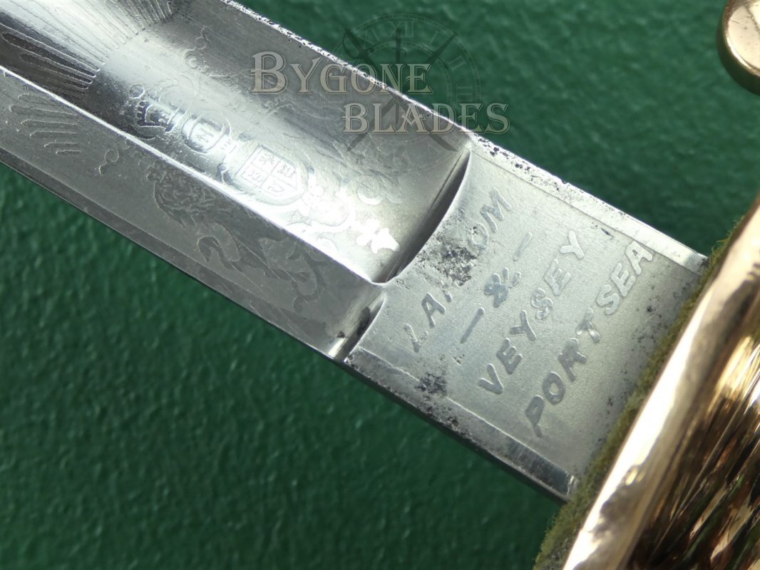 The ricasso bears the proof disk of George Alfred Pillin. This style of disk was in use between 1887 and 1901, dating the sword to between these dates. The obverse ricasso bears the cutlers details, “Larcom & Veysey, Portsea.” Larcom & Veysey were outfitters who traded between 1882 and 1905 from premises at 52, Queen Street, Portsea.