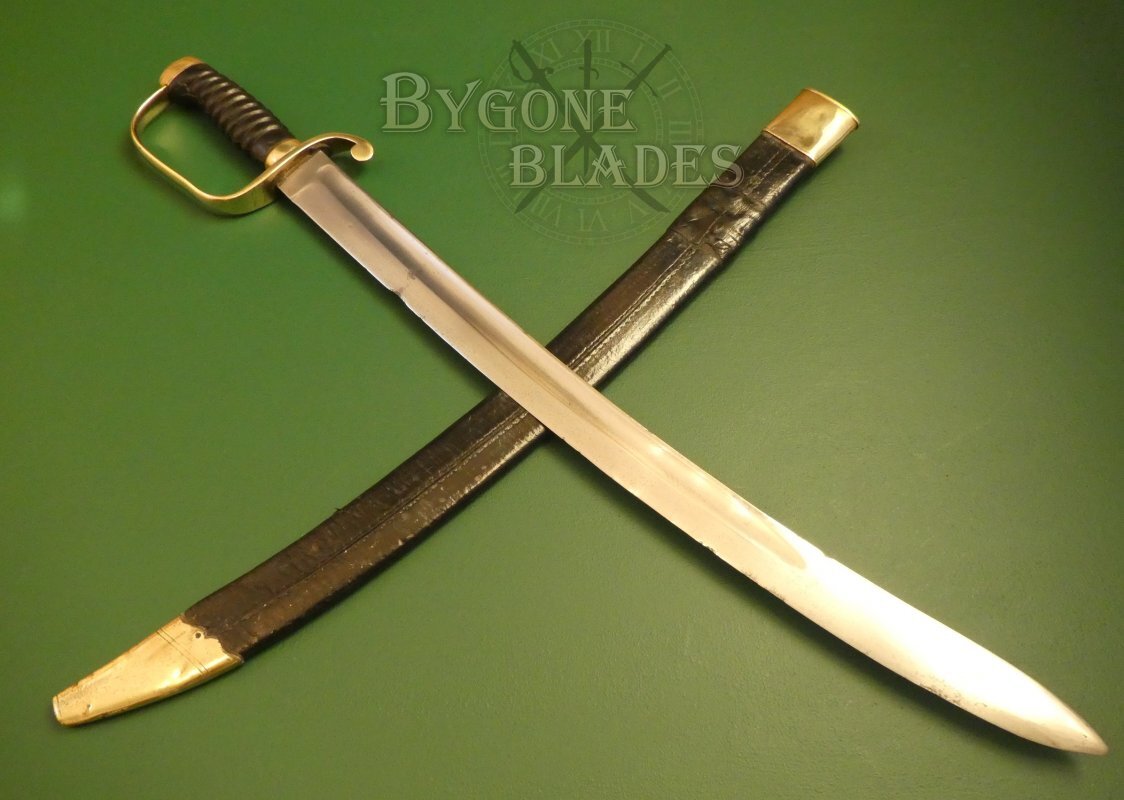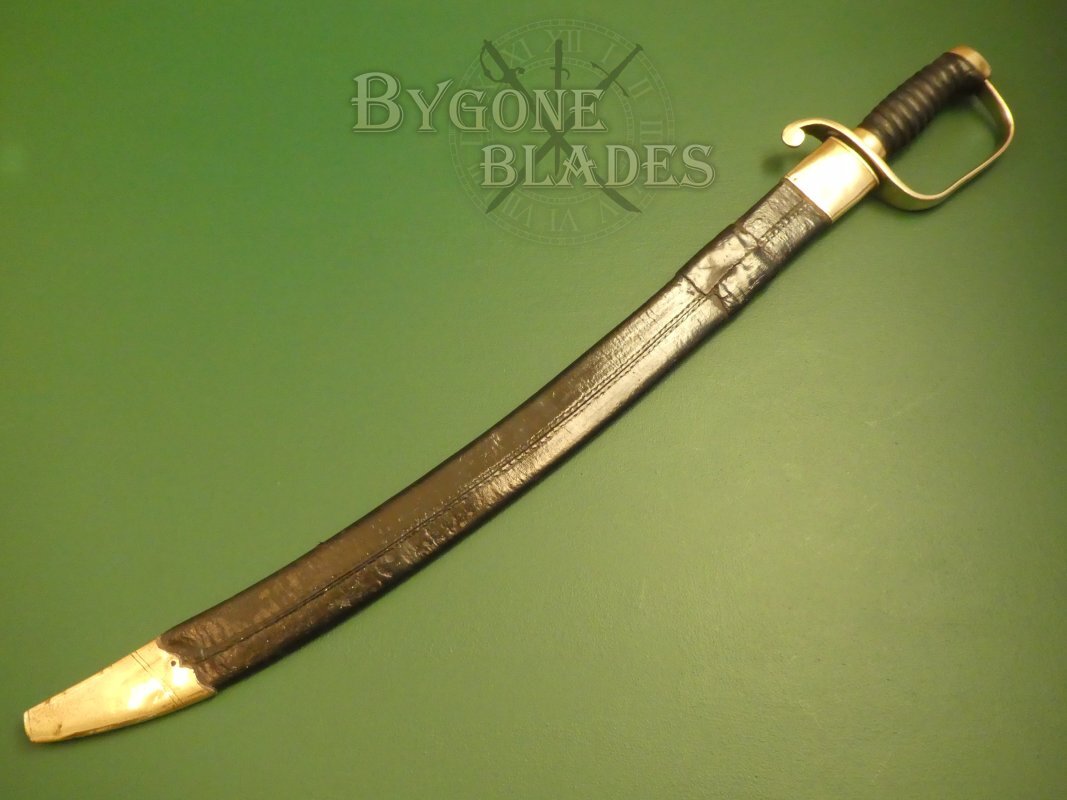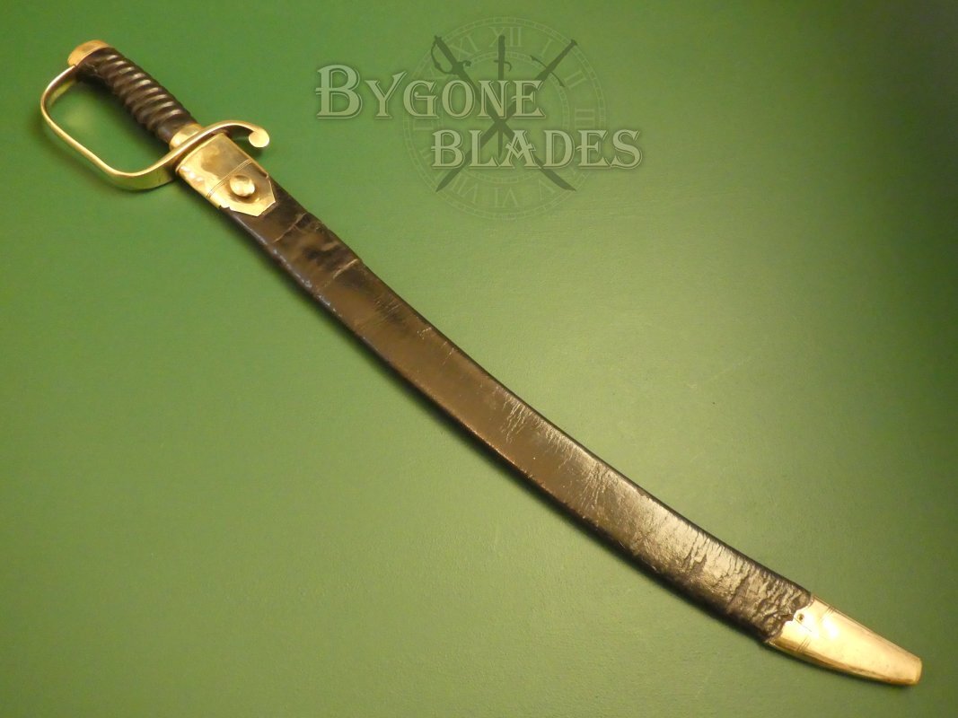 The sword is complete with its original leather scabbard with brass furniture. The locket and chape are in good condition with a pleasing patina. The brass chape has a thin crack at the top and is securely fixed to the scabbard. The leather of the scabbard is in generally good condition. The stitching has perished in places and the scabbard has a good (possibly period) repair to the leather. An additional piece of leather has been fitted to reinforce a weak area. The sword sheathes and draws smoothly and is held firmly within the scabbard.