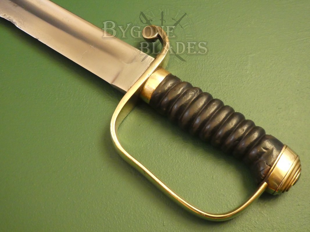 The brass guard has a “D” shaped knuckle bow with stepped oval pommel and disk quillon. The contoured wooden grip is wrapped with leather. The grip is in good condition with mild use related wear. The blade is firm in the hilt.