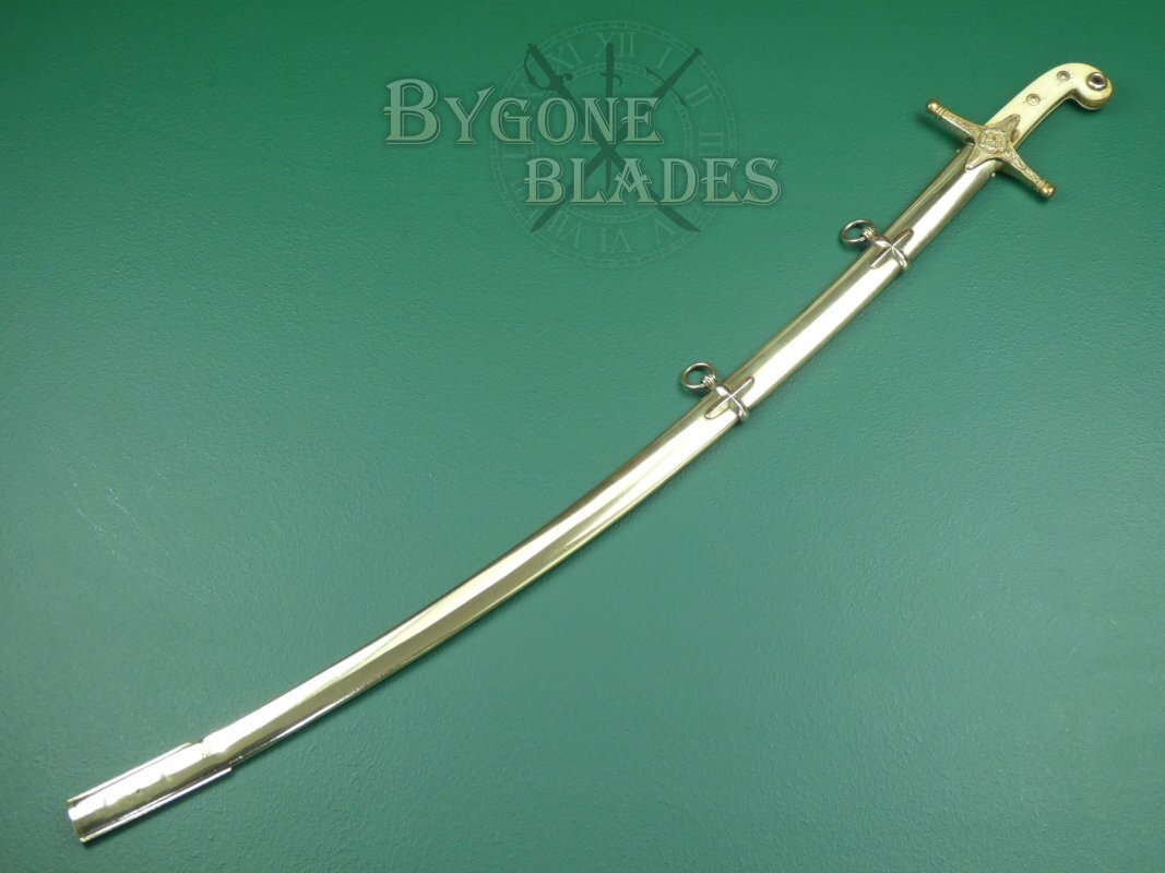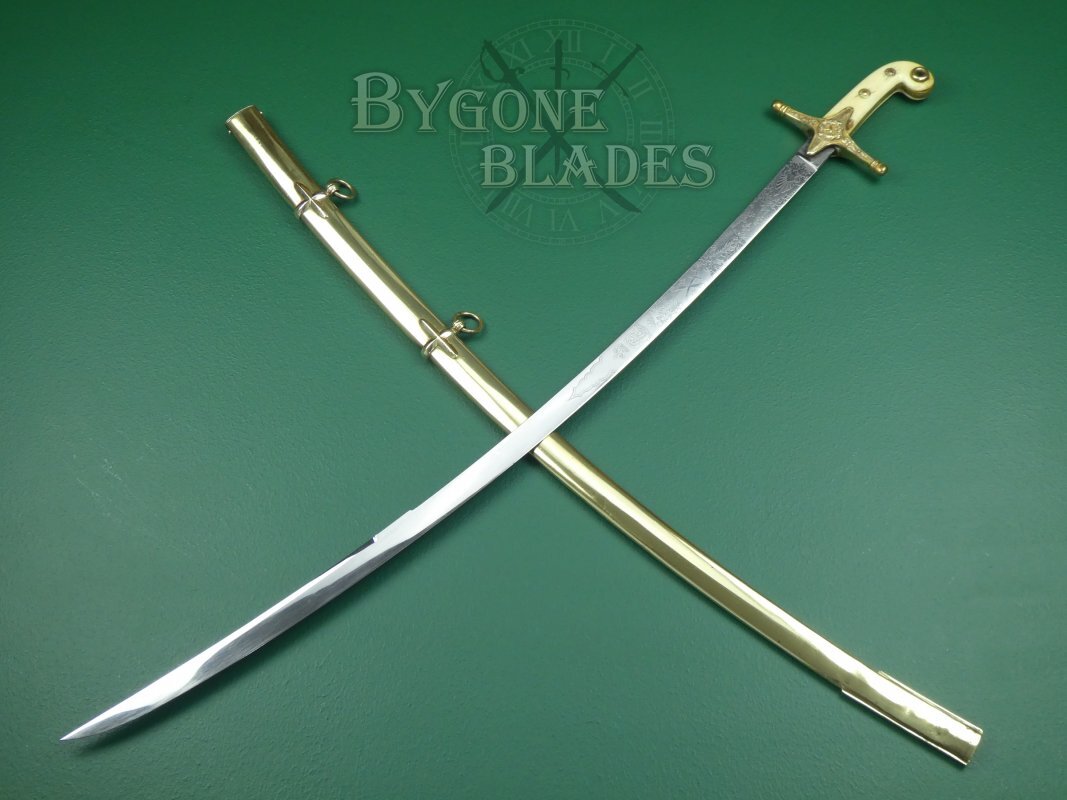 The sabre is complete with its heavy duty gilt brass scabbard with two hanging rings. The scabbard is in very good condition. The sabre draws and sheathes smoothly and is held firmly within the scabbard.