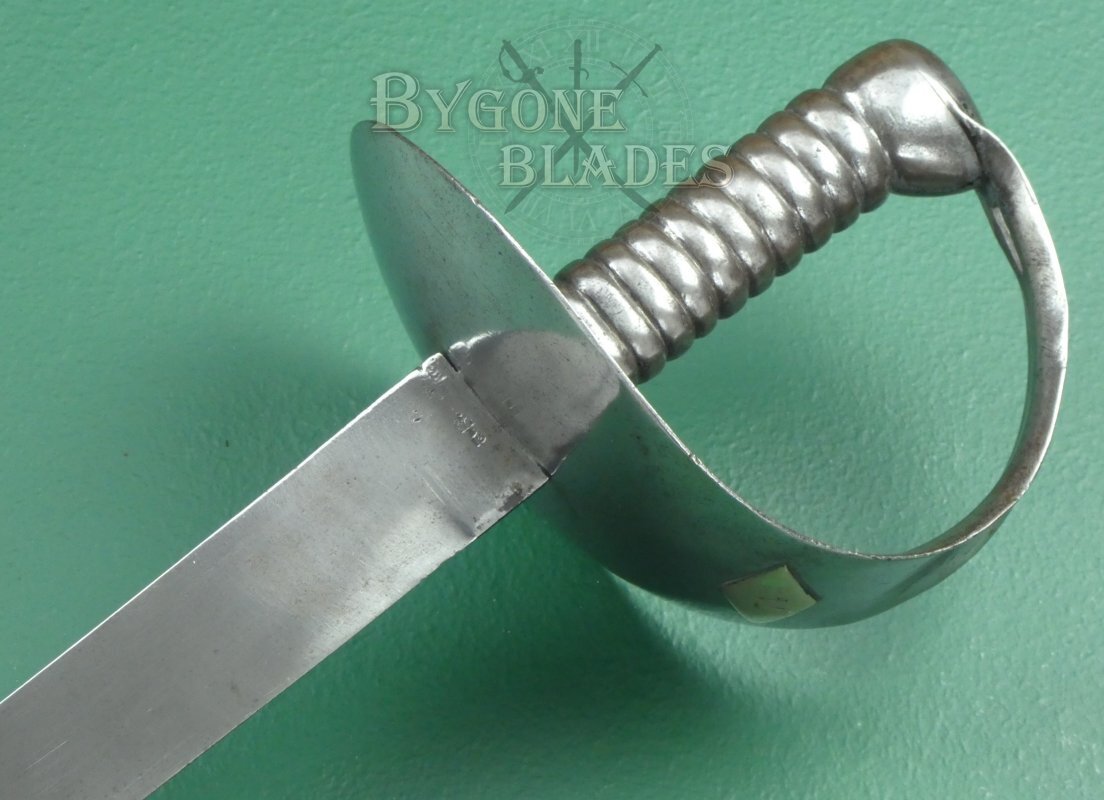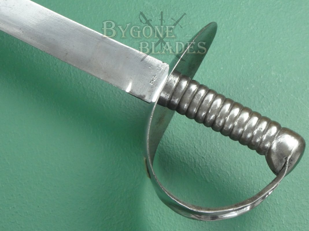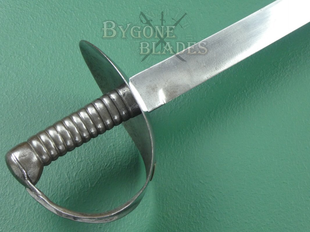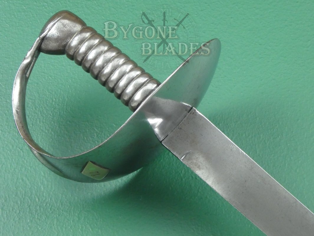 The original of the 1845 pattern cutlasses (of which this is one) can be distinguished from the later models by the larger width of the basket guard and the distance between the grip to the bulge of the guard, which was around 70mm (2 and ¾ inches) in the first pattern. The pommel of the cast grip also swells out considerably on the first pattern. Second pattern guards have an oval piece of metal fitted around the blade and riveted to the inside of the guard. The third pattern, circa 1858 has a narrower basket with a forward pointing lip to the front of the guard and the grip pommel has a much smaller flare.