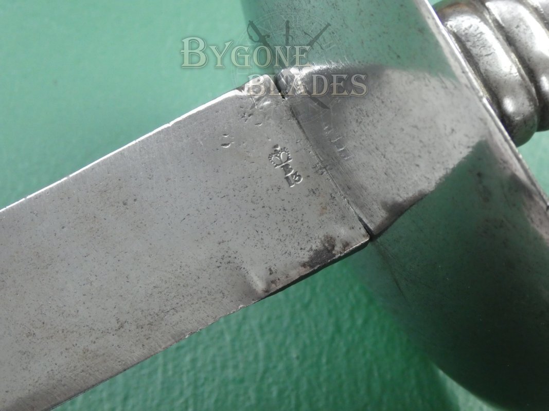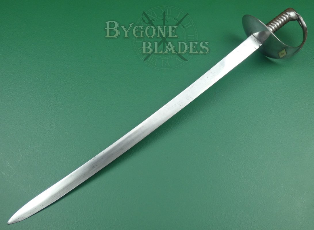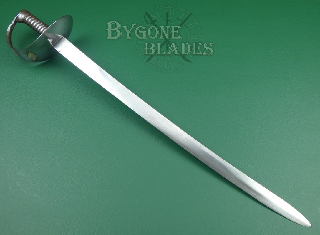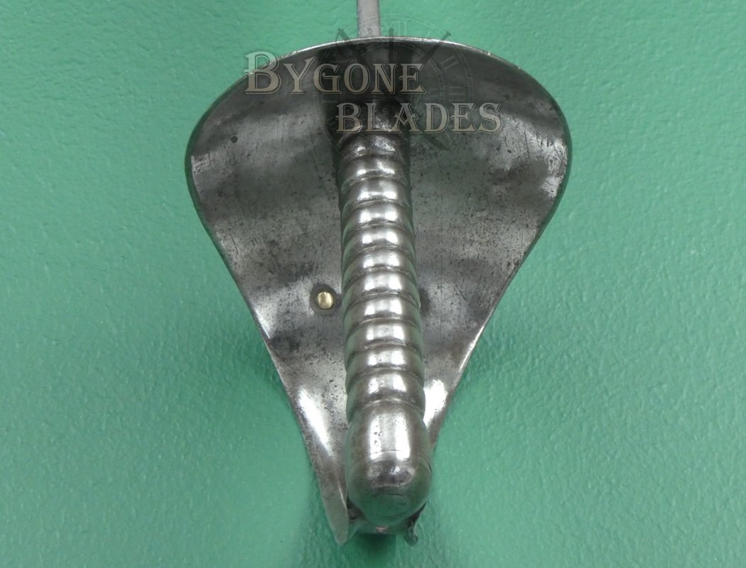 The original of the 1845 pattern cutlasses (of which this is one) can be distinguished from the later models by the larger width of the basket guard and the distance between the grip to the bulge of the guard, which was around 70mm (2 and ¾ inches) in the first pattern. The pommel of the cast grip also swells out considerably on the first pattern. Second pattern guards have an oval piece of metal fitted around the blade and riveted to the inside of the guard. The third pattern, circa 1858 has a narrower basket with a forward pointing lip to the front of the guard and the grip pommel has a much smaller flare.