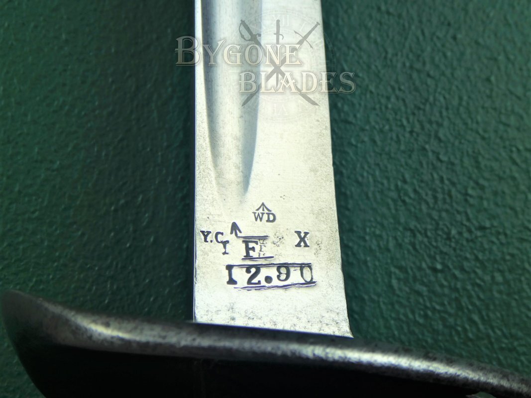 The spine is stamped with an inspection mark and the government small arms factory name, “Enfield.” The ricasso bears a War Department arrow and WD along with a bend test X and an Enfield inspection stamp. The ricasso is also stamped with a yeomanry cavalry Y.C. mark. A later Indian Government Stores mark, I below an arrow is also present along with an F and the re-issue date of 12’90 (December 1890). The obverse ricasso bears a production date of 9/85 (September 1885) and a Birmingham inspection & reissue date of /95 (1895), at which point the sword passed from regular service to the Yeomanry Cavalry.