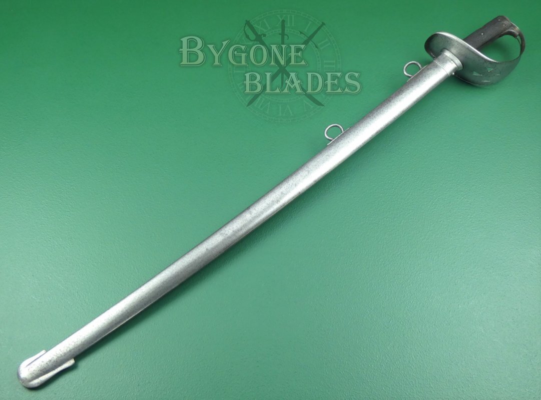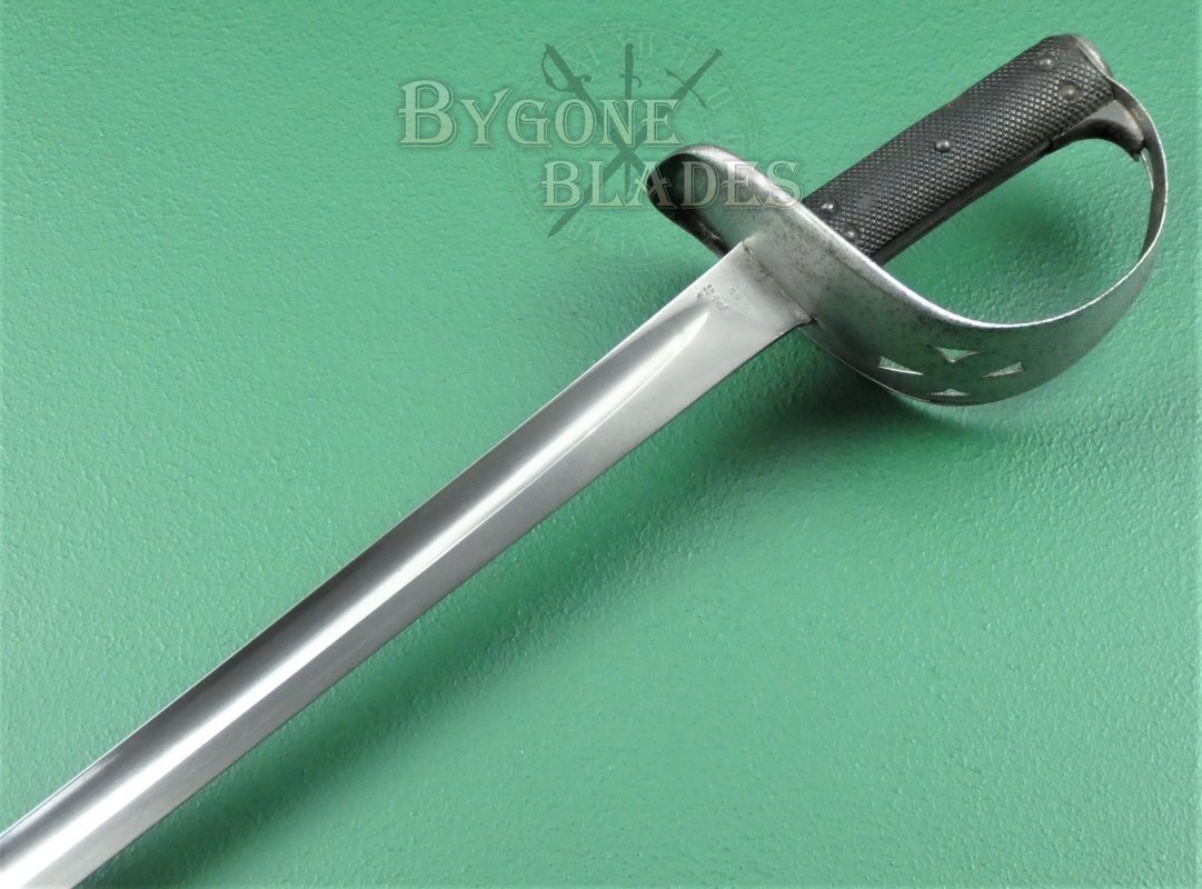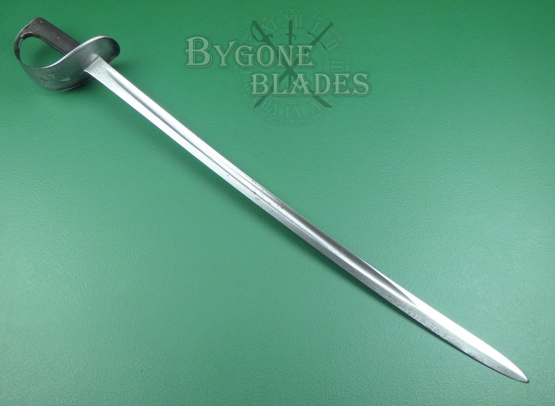 The British 1882 pattern cavalry trooper’s sword was the result of experiments beginning in 1878 to improve on the balance, weight and handling of British cavalry trooper’s swords. As a result of the experiments, two patterns of sword were proposed, the 1882 “Short” and the 1882 “Long.” The only difference between the two swords was in the blade length, the “Short” having a length of approximately 838mm (33 inches) and the “Long” being 900mm (353/8 inches) in length.