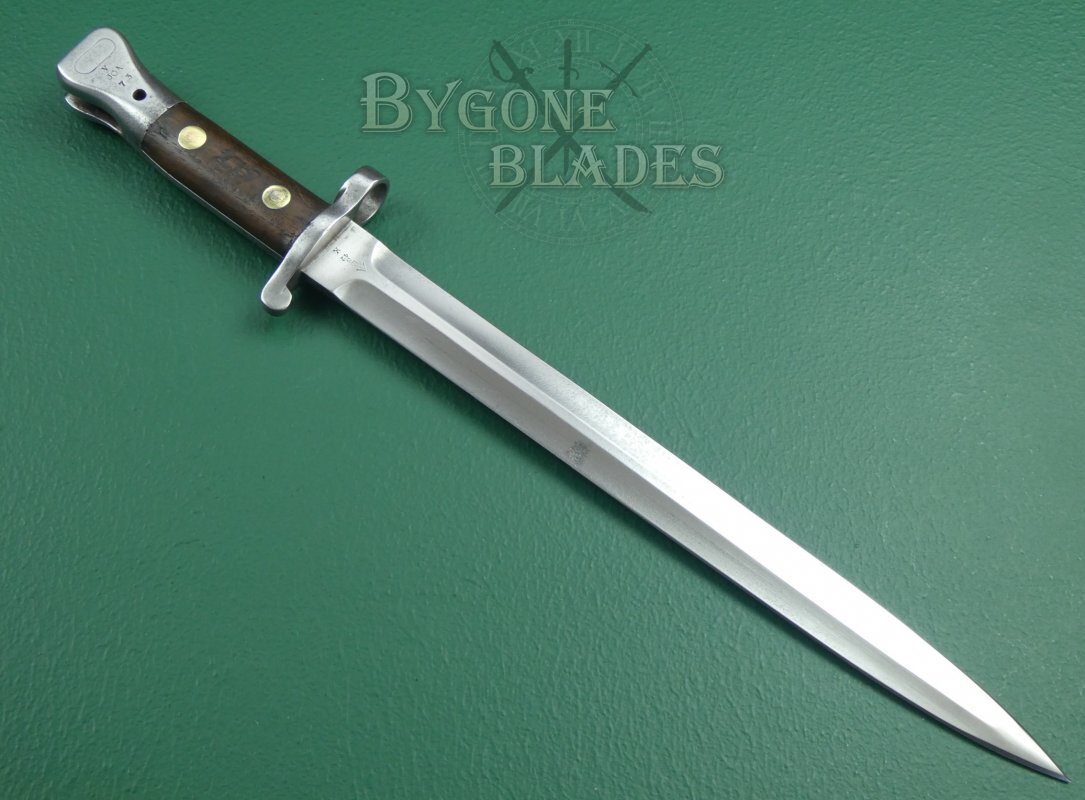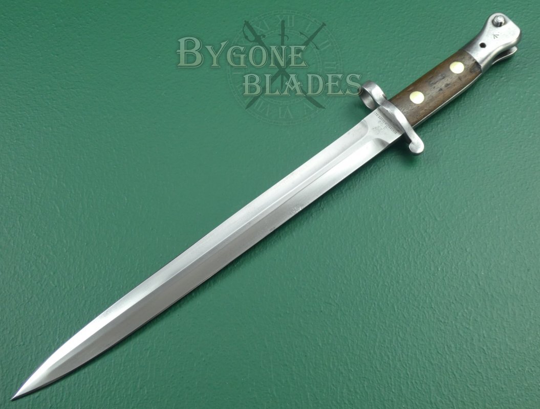 This desirable bayonet is in excellent condition for its 119 years of age and is highly collectable. The 306mm double-edged blade is marked on the ricasso with a crown above ER (Edward Rex) and the production date, 3 ‘02 (March, 1902) over the manufacturer’s details; Sanderson, Sheffield.