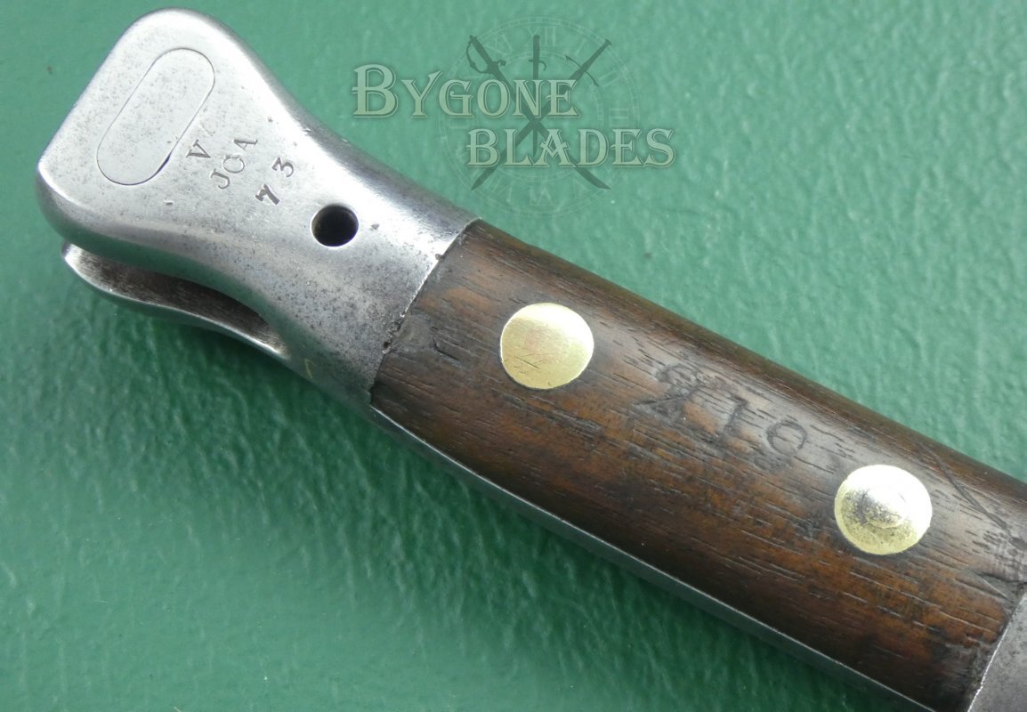 The wooden grip is firm and in good condition with two brass rivets. The facing grip scale is stamped with the number 219. The rear scale bears a crowned inspection stamp. The steel crosspiece and pommel are bright and free from rust. The pommel is stamped above the clearing hole with V over JOA above the number 73. The obverse of the pommel bears a sold out of service mark. The press-stud locking mechanism is in good working order.