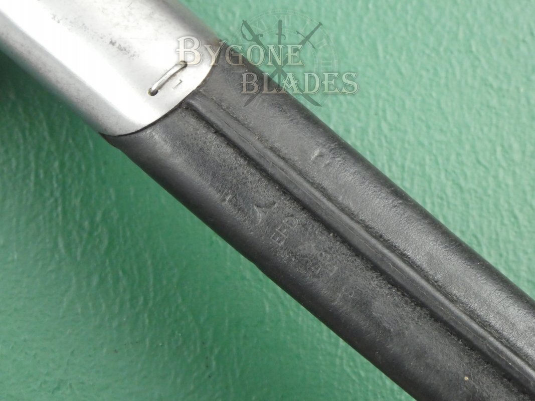 The bayonet is complete with its black leather scabbard with steel mounts. The steel locket and chape are in good condition and bear Enfield inspection marks. The black leather is in good condition and is stamped with the War Department arrow, EFD makers’ mark and an Enfield inspection stamp. The stitching is intact and tight. The bayonet sheathes and draws smoothly and is held firmly within the scabbard.