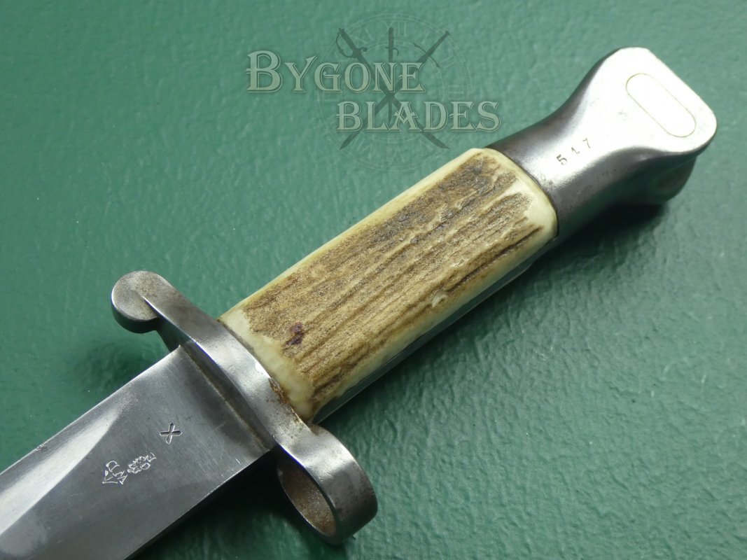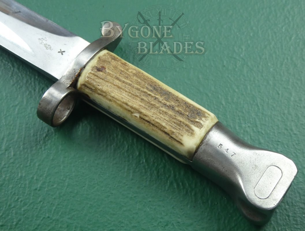 The stag antler grip is firm and in excellent condition. This is the first time I have encountered an 1888 bayonet with antler grip scales. The scales are likely to be a post-production addition and may have been added to make the bayonet a presentation piece. The steel crosspiece and pommel are bright and free from rust. The pommel is stamped with the number 547. The press-stud locking mechanism is in perfect working order.