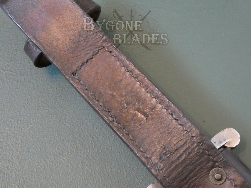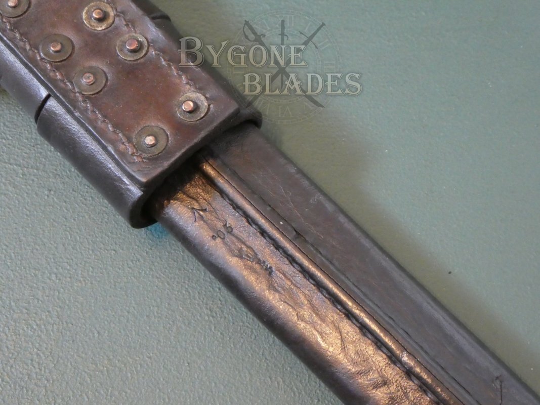 The end of the pommel is stamped with the initials “SB & N,” indicating that the conversion from P1888 to P1903 was carried out by Sanderson & Neubold of Sheffield. The press-stud locking mechanism works perfectly. The wooden grip scales are in good condition with age and use related marks and dings. The grip scales are stamped with A123 on one side and an obscured letter and number combination on the obverse. These may be Royal Navy related and may correspond to a gun crew.