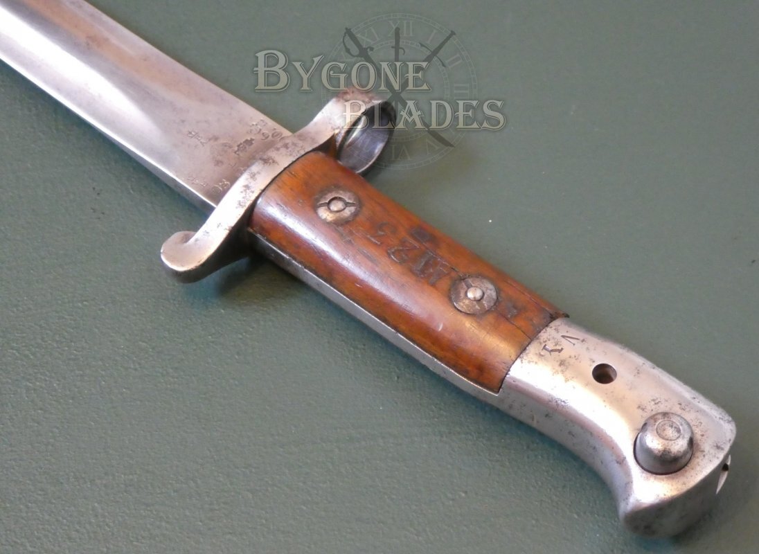 The steel crosspiece and pommel retain their original polished finish with minimal age related marks. The pommel bears an “N” denoting naval issue. Beside this is a “Y,” indicating that the bayonet was passed to the Yeomanry. This is supported by the late re-issue dates, particularly that of 1909.