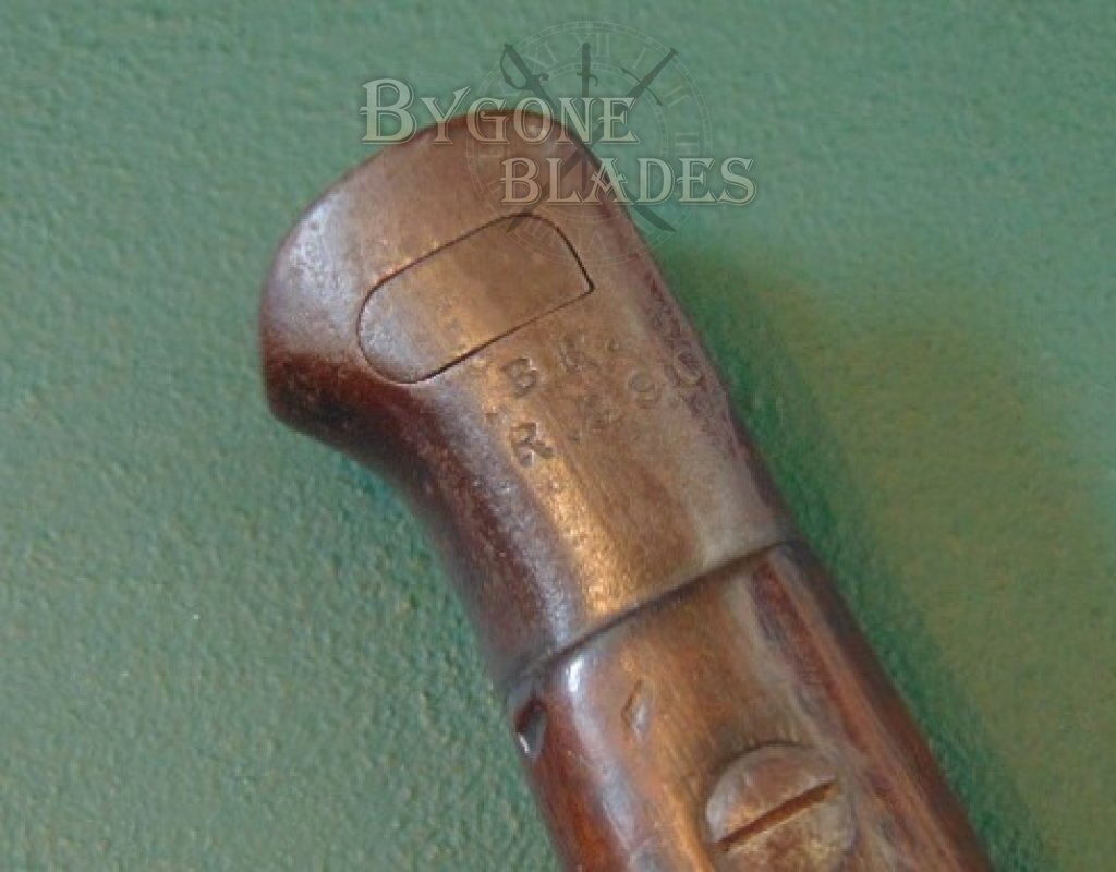 The hooked quilloned crosspiece retains its original blueing, as does the steel pommel. There is some mild wear. The pommel is stamped with the regimental markings “B. R. R.” and the issue number “290.” The wooden grip scales are in very good condition and are held firmly in place by the two original screws. The push button locking mechanism is in good condition and the action is crisp.