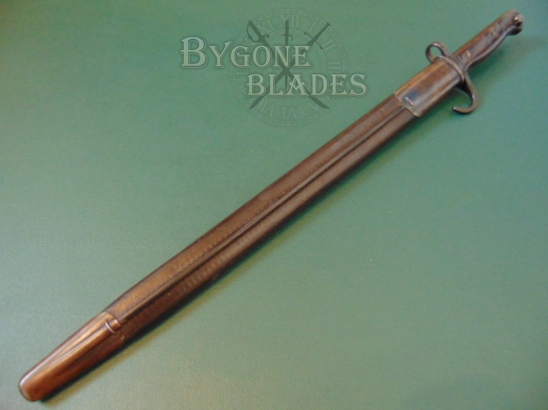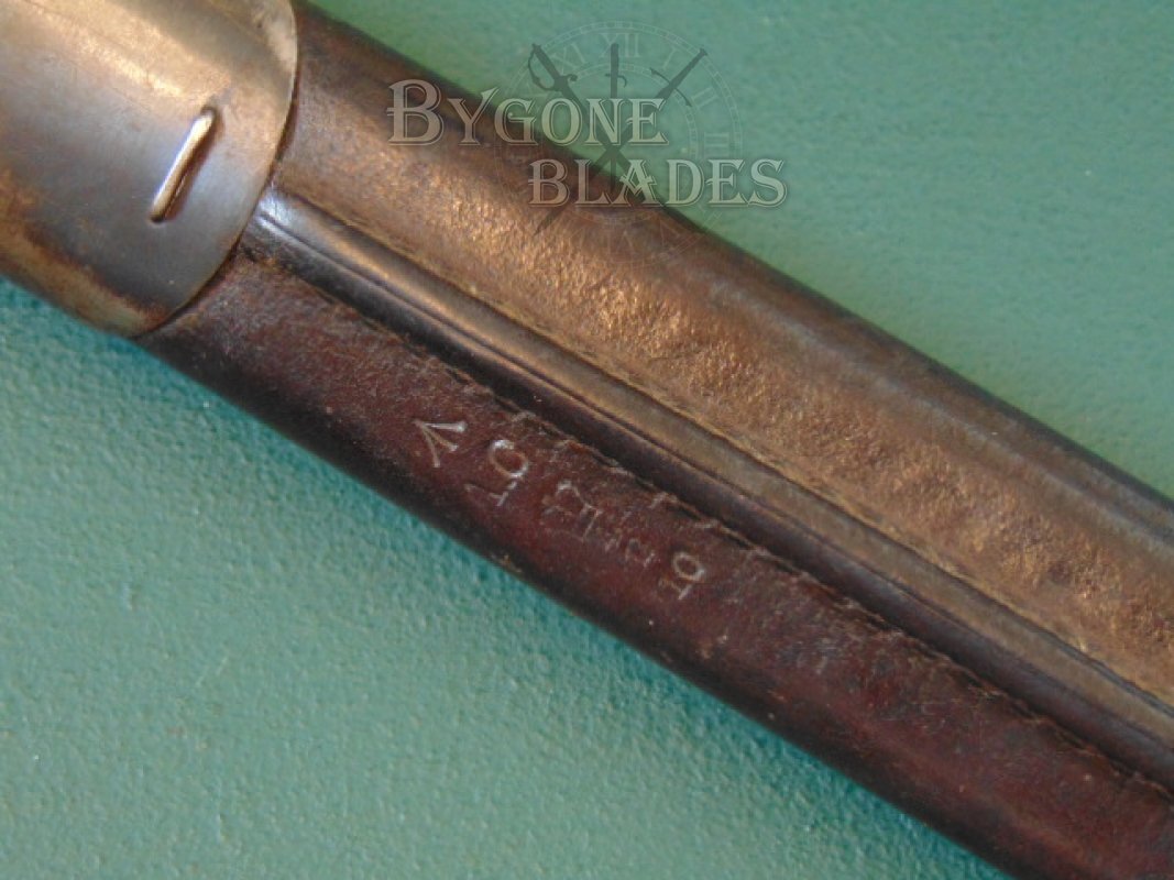 The bayonet is complete with its No1 Mk ll leather scabbard with a teardrop stud. The scabbard is in very good condition with most of its original blued finish to the locket and chape. The leather and stitching are strong. The leather is stamped with the War Department arrow, the letters A C, an inspection mark and the date ‘10 (1910). The steel locket and chape bear crowned inspection stamps.