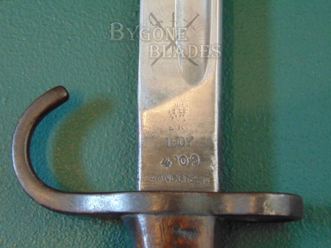 The ricasso retains its original blueing and is marked with the crowned cypher of Edward VII over the pattern date 1907 and the date of manufacture 4 ‘09 below which is stamped “Sanderson.” The obverse ricasso bears the War Department broad arrow, bend test stamp and three inspection and acceptance stamps.