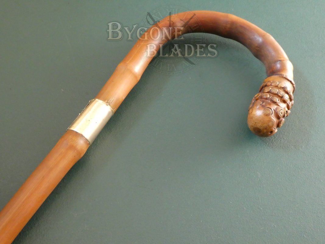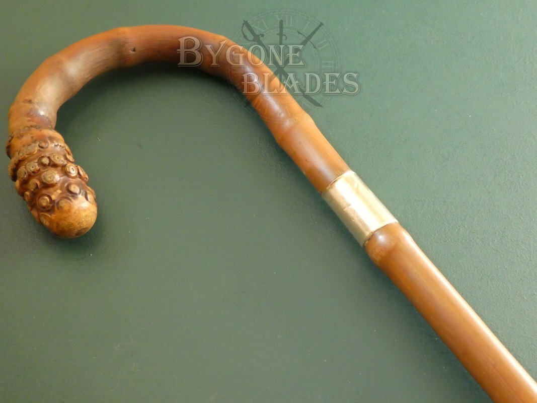 Antique British bamboo root-ball sword cane with gilt metal collar bearing the maker’s mark JH.