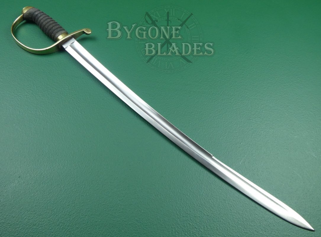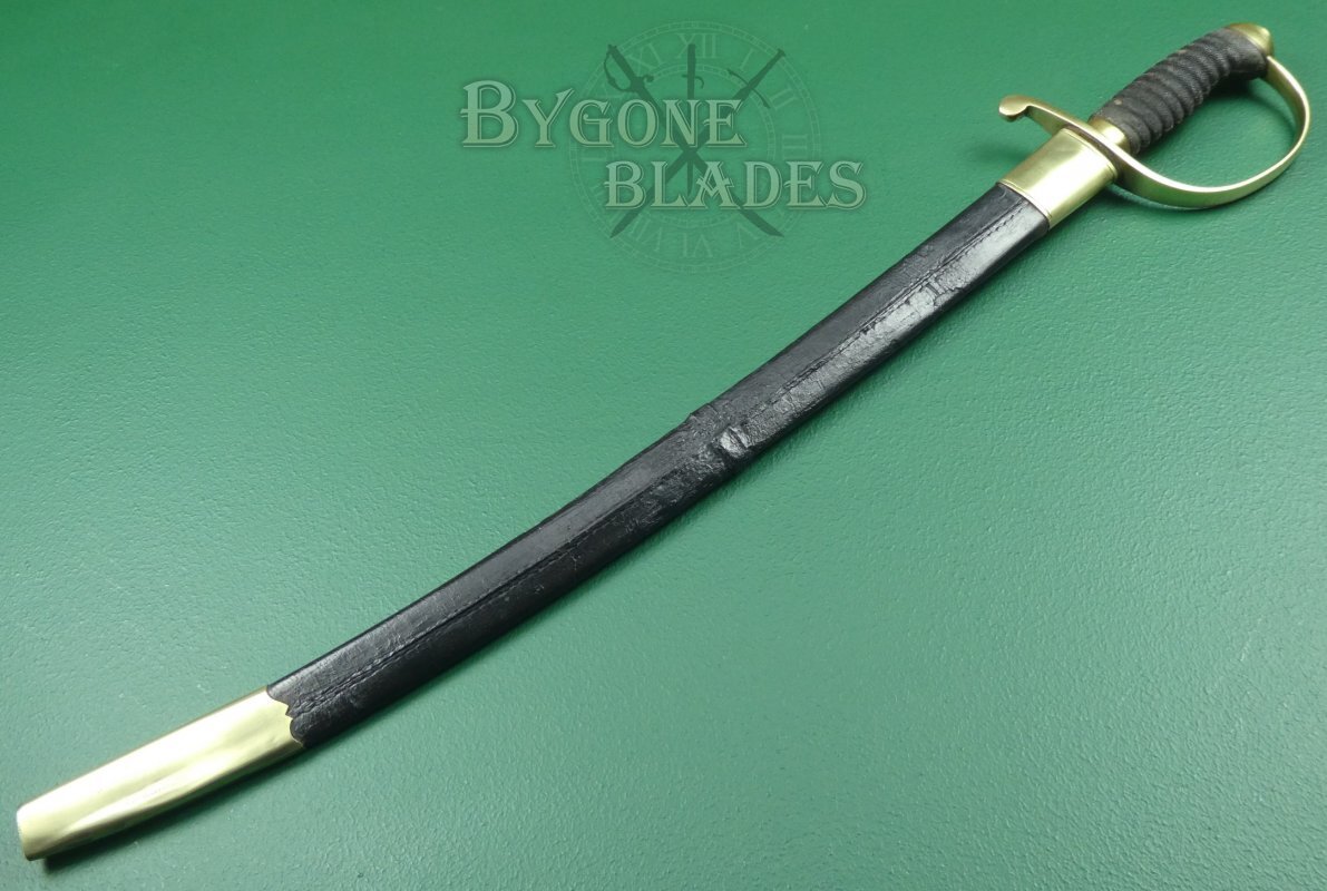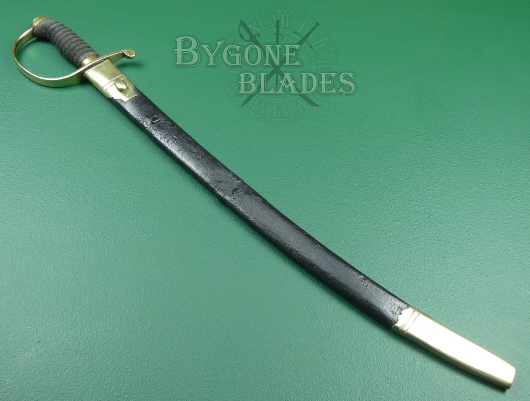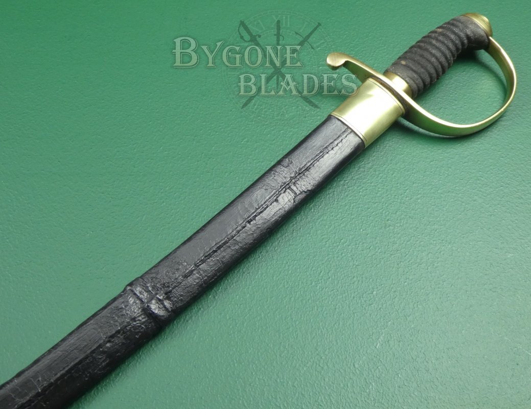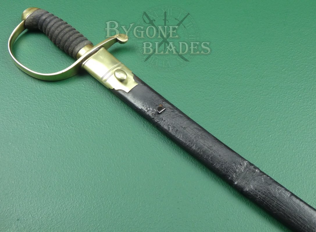 The sword is complete with its original leather scabbard with brass furniture. The brass locket is original to the scabbard but the chape looks to be a later replacement although it is an excellent match. The leather of the scabbard is in good condition and has what looks to be a period repair towards the middle, a thin band of additional leather having been added. This was probably done to reinforce a weak point as these scabbards were prone to bending eventually resulting in tears to the leather. The sword sheathes and draws smoothly and is held firmly within the scabbard.