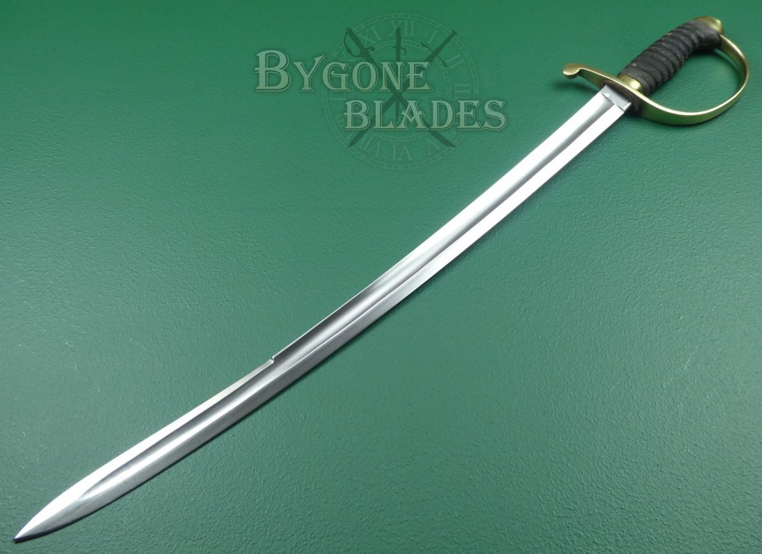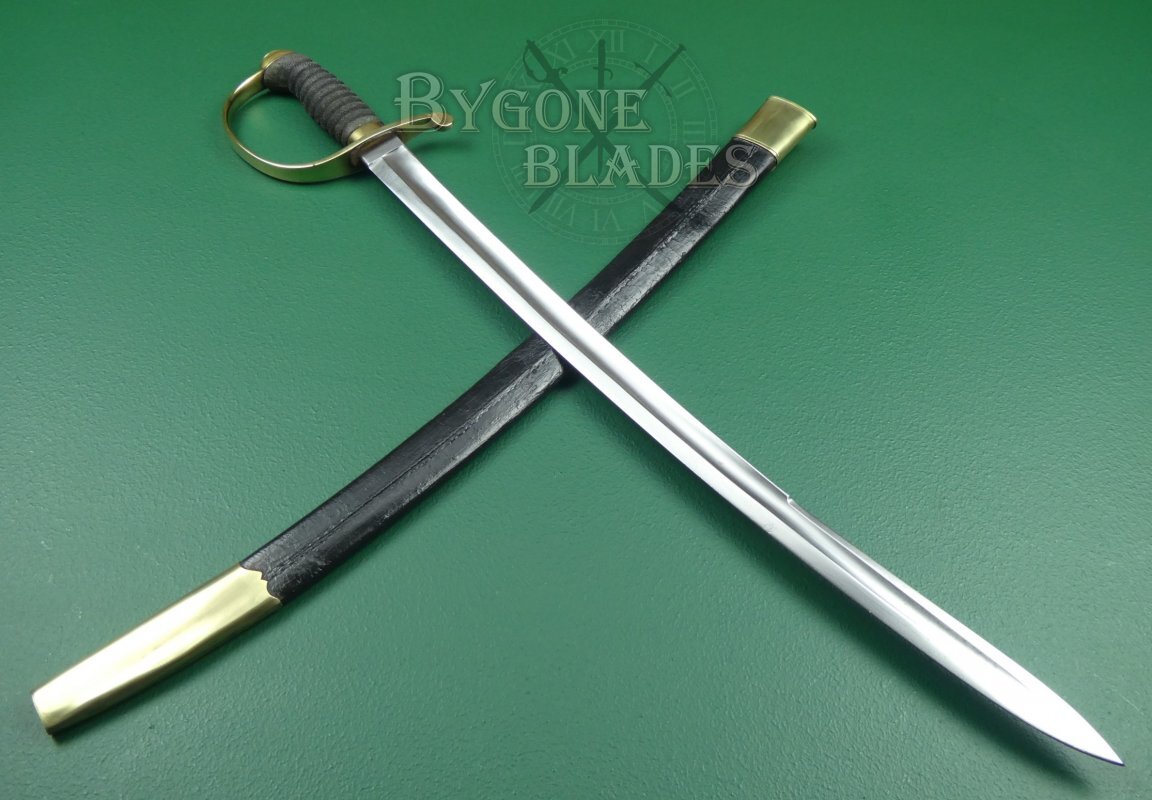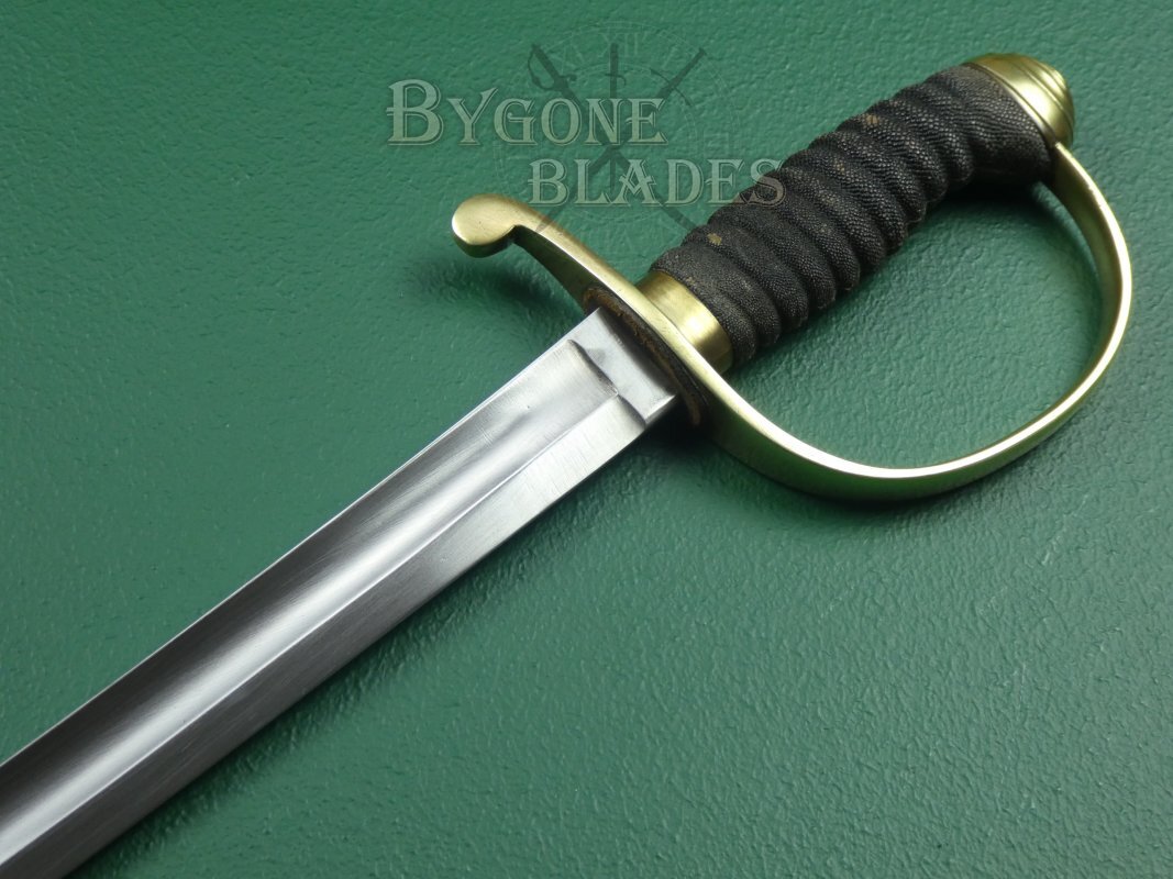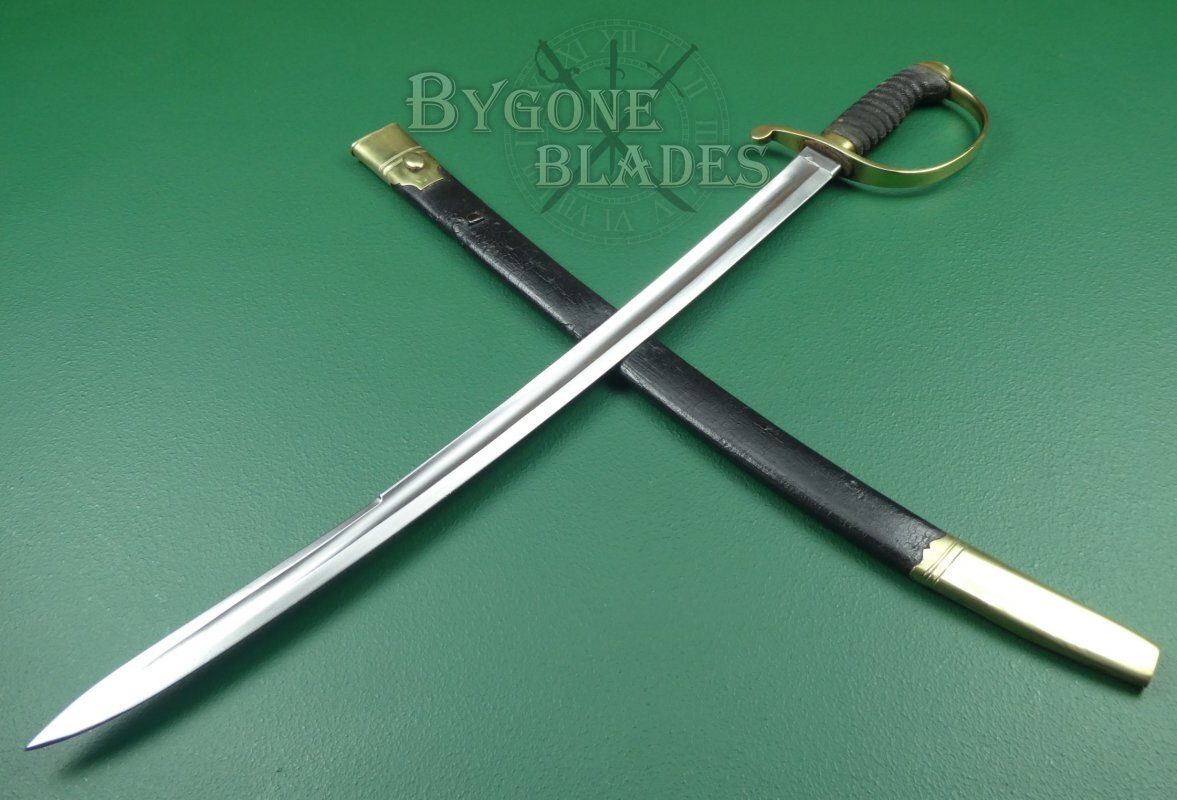 The sword is complete with its original leather scabbard with brass furniture. The brass locket is original to the scabbard but the chape looks to be a later replacement although it is an excellent match. The leather of the scabbard is in good condition and has what looks to be a period repair towards the middle, a thin band of additional leather having been added. This was probably done to reinforce a weak point as these scabbards were prone to bending eventually resulting in tears to the leather. The sword sheathes and draws smoothly and is held firmly within the scabbard.