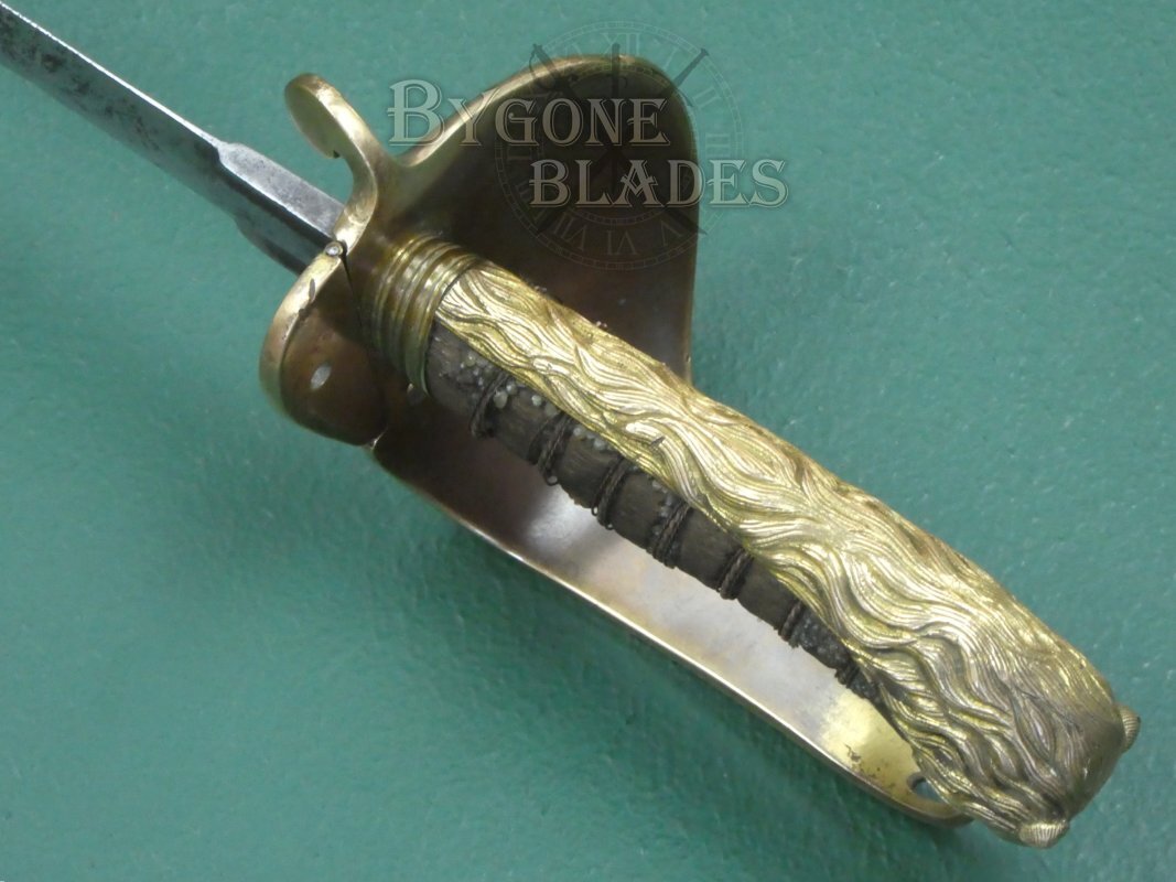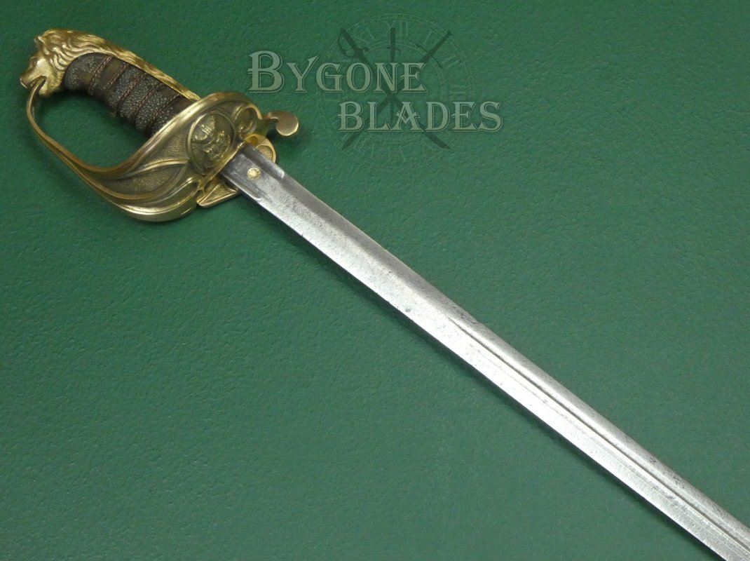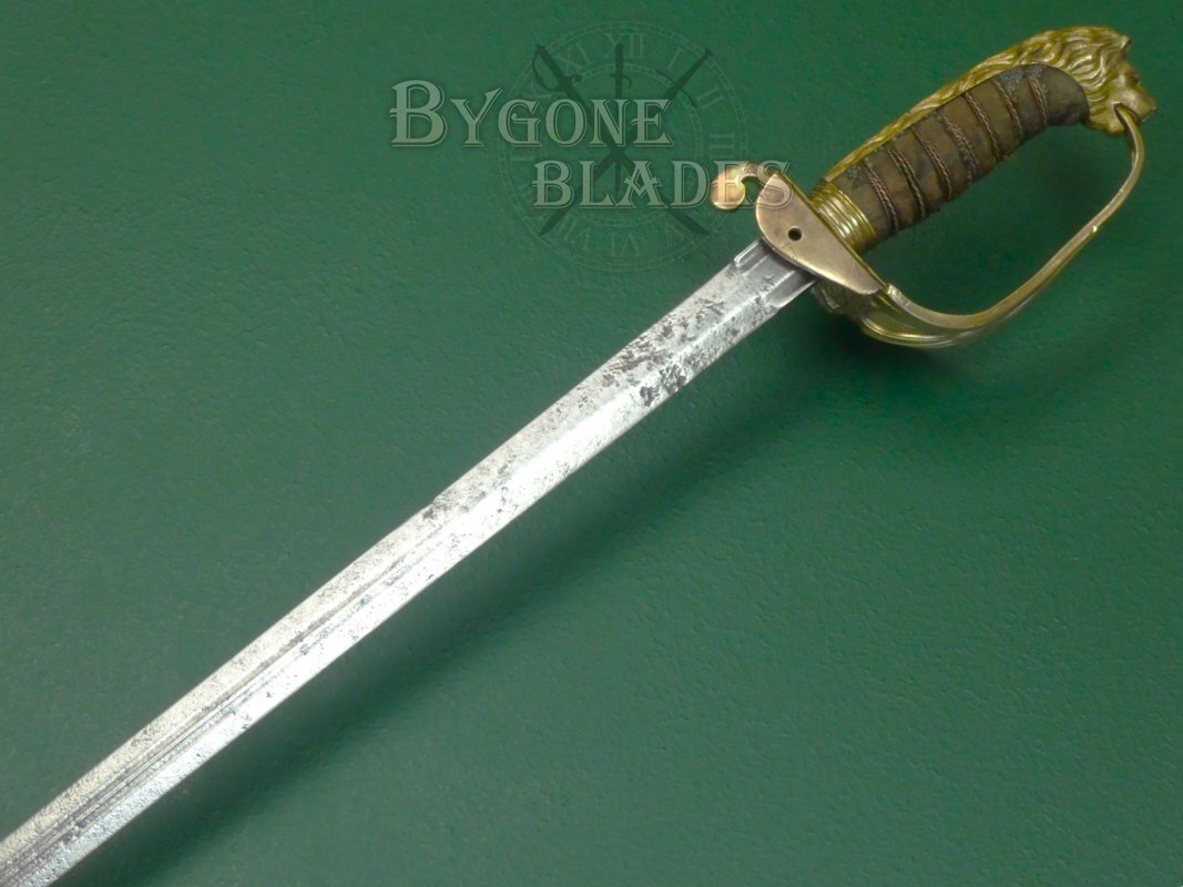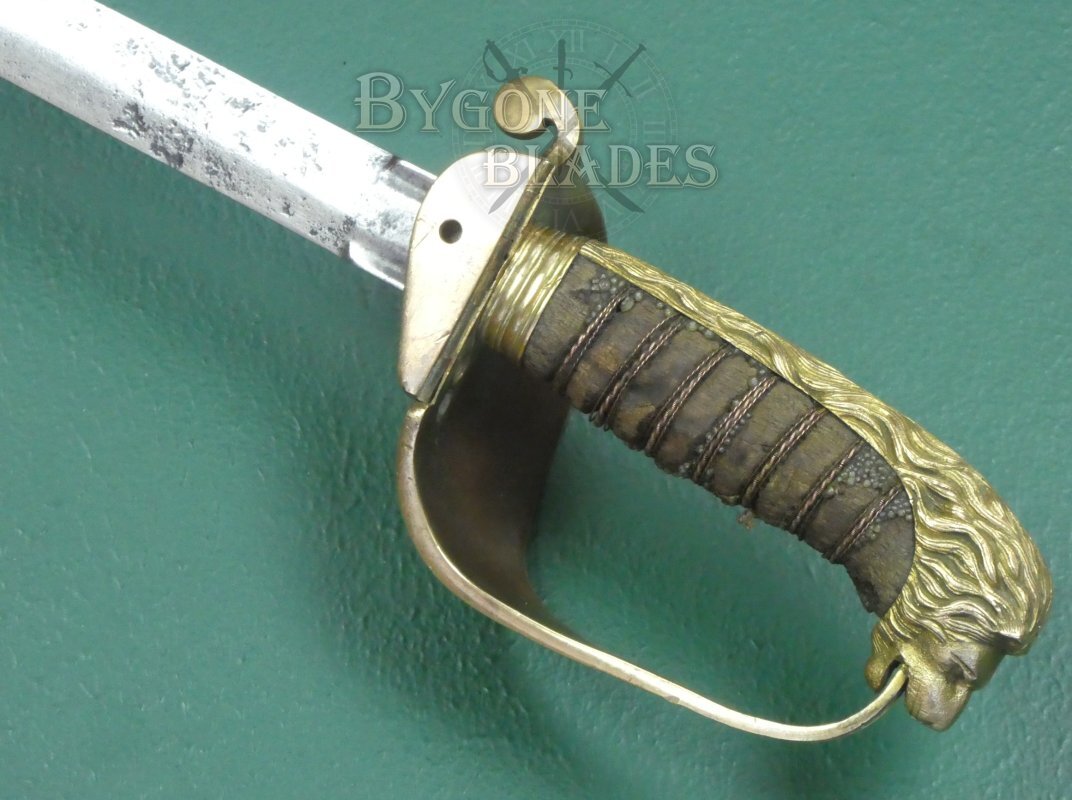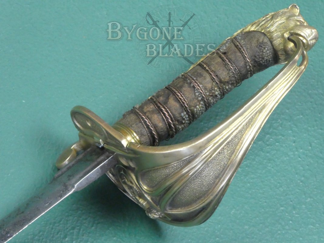 The mane of the highly detailed lion head pommel runs the full length of the back strap and the “D” guard extends from between the lion’s jaws. This helps date the sword to mid-19th Century. The ray skin grip is mostly absent. The twisted copper wire is present and correct. The blade is firm in the hilt.