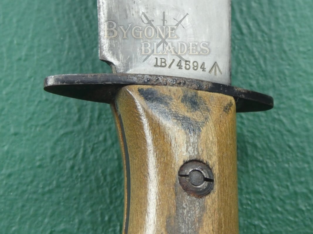 The base of the blade is stamped with the Wilkinson Sword Company trademark and “REGD DESIGN APP FOR.” The obverse bears the pre-NATO stores designation, “1B/4594” besides the War Department Broad Arrow mark.