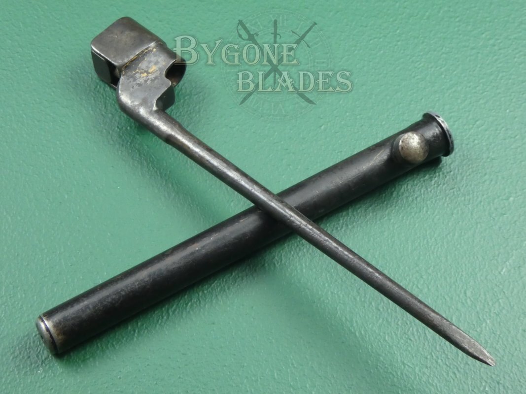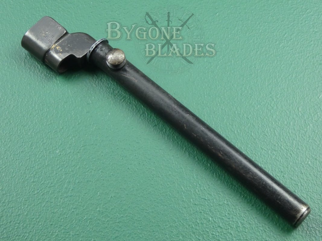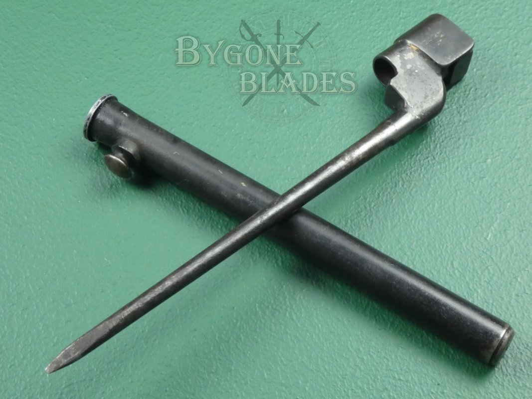 The bayonet is complete with a rare experimental Mk II, parallel sided, light weight steel scabbard. Only 25,000 of these Mk II scabbards were produced by the Franco-British Electrical Company. The company’s dispersal code, S191 is stamped on the bottom of the scabbard.