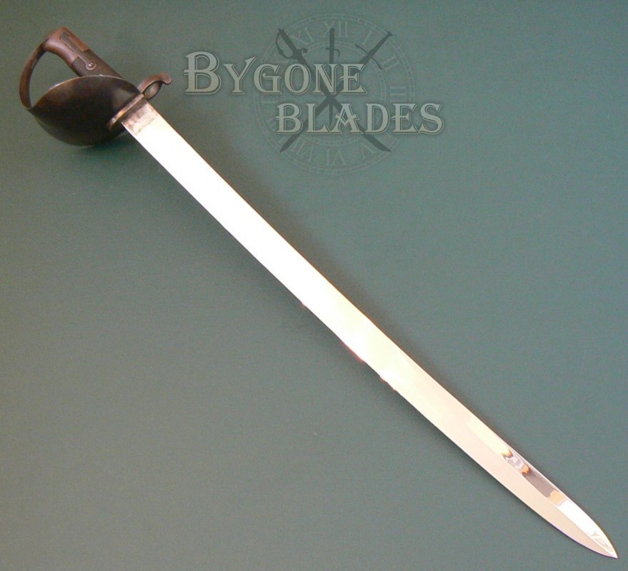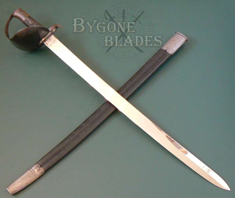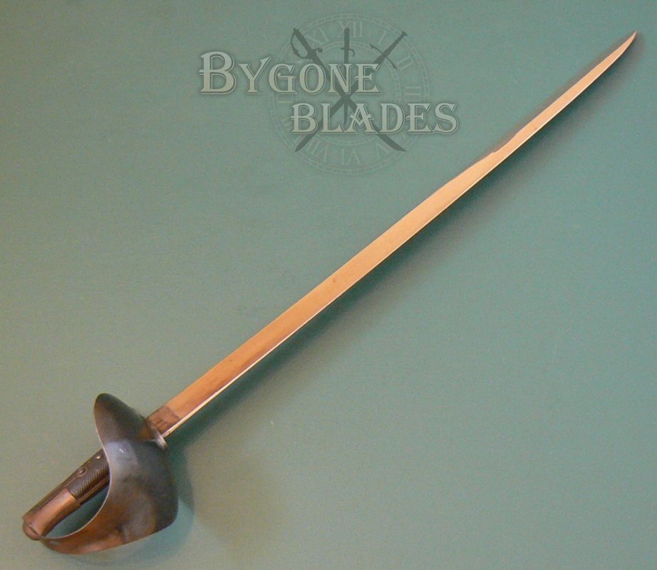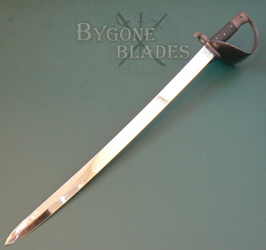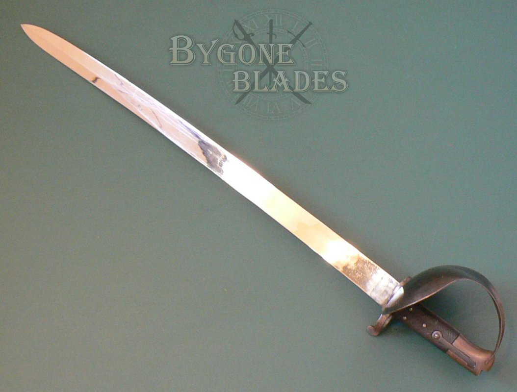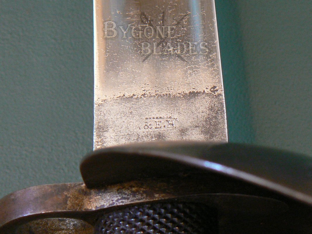 The 680mm un-fullered blade has a flat spine and single-edge. The blade terminates in a spear point and has a 240mm upper false edge. The blade is in near mint condition and is unsharpened. The forte is stamped with an oval cartouche containing the worn maker mark "A. & E. H.," the stamp of A. & E. Holler of Solingen Prussia who used this trademark between 1854 and 1885.