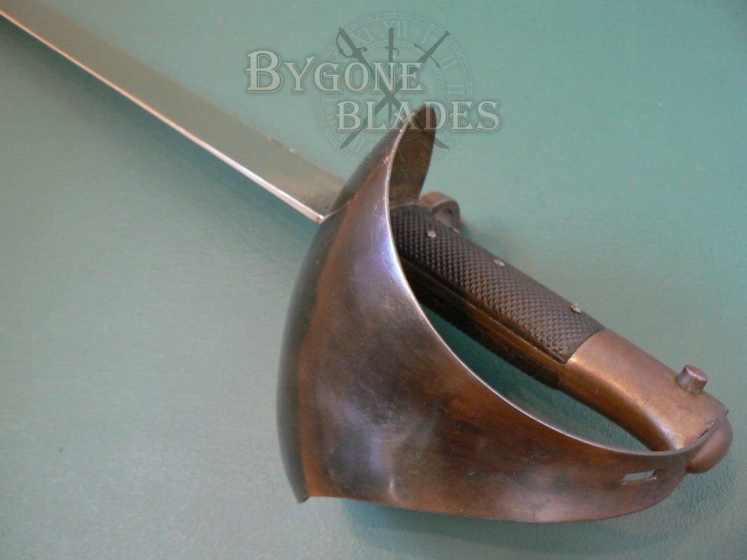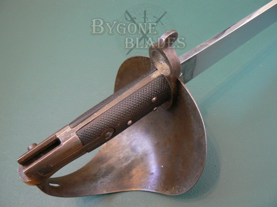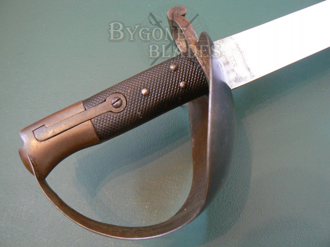 The blackened steel bowl guard is in excellent condition and retains its original finish. The chequered leather grips are in similarly excellent condition and the external spring catch works perfectly. The lack of British War Department or Naval ownership and inspection stamps suggests that this cutlass bayonet was one of those made for export.