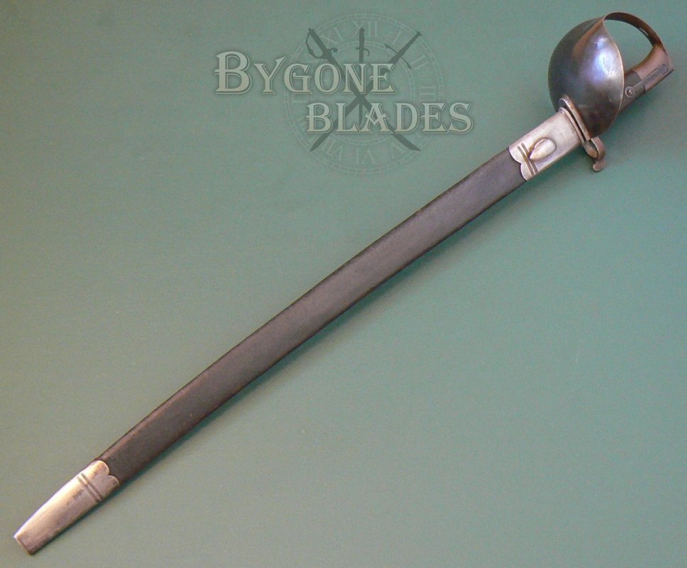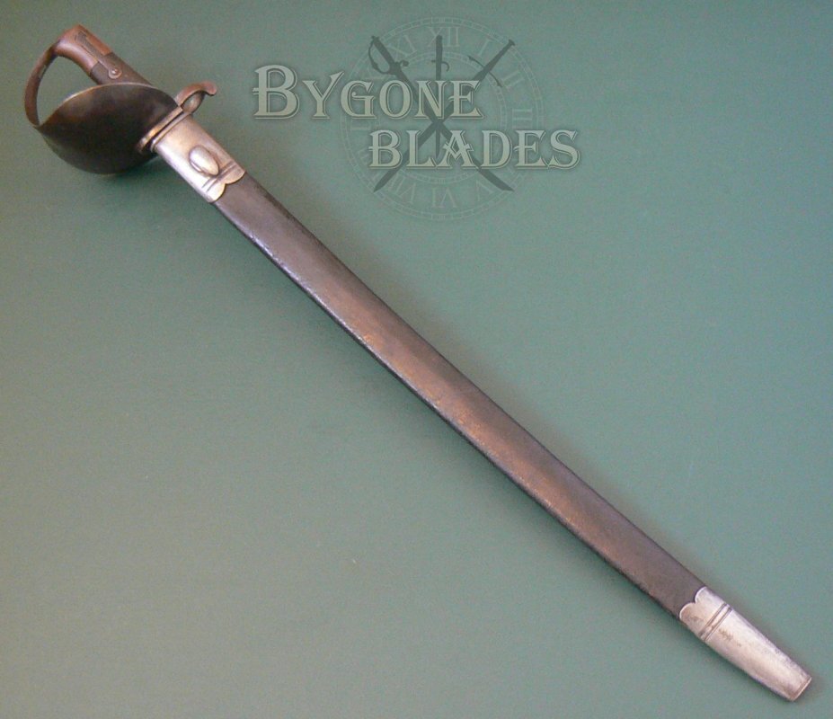 The cutlass bayonet is complete with its original black leather, steel mounted scabbard. The leather is in excellent condition with the stitching intact and tight. The steel locket and chape are in great condition and have a pleasant pale patina.