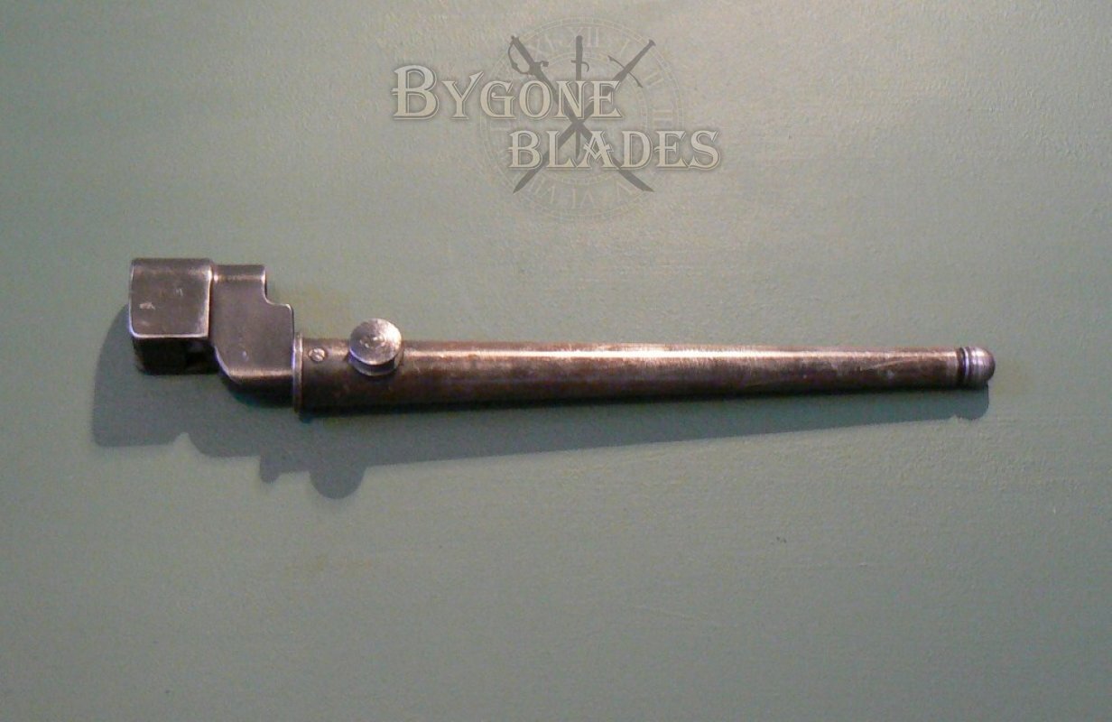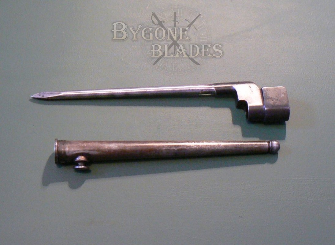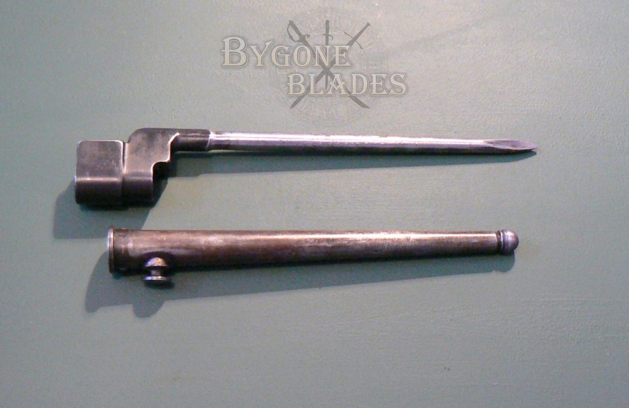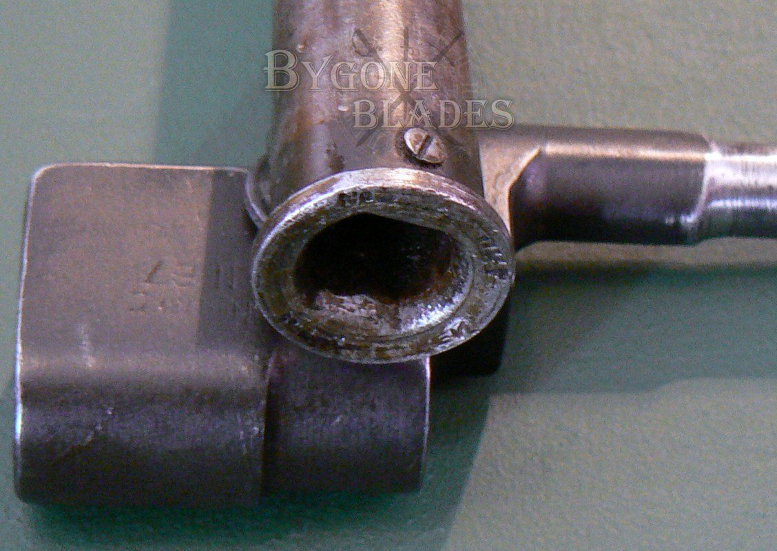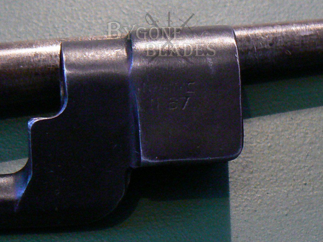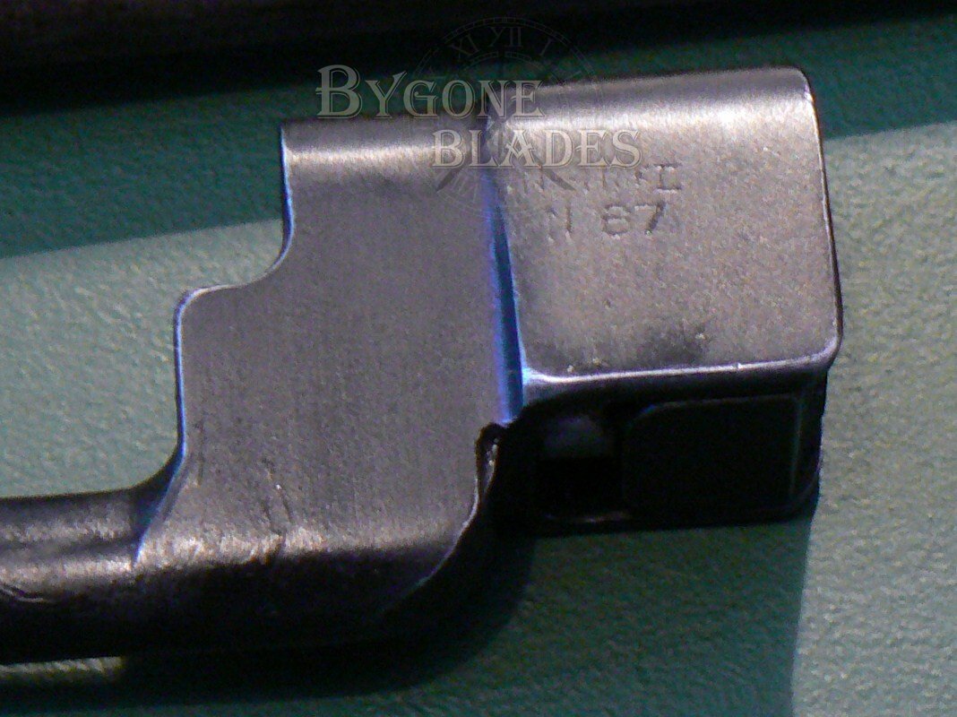 Excellent condition British No4 MkII bayonet made by the Singer factory in Scotland as indicated by their war time dispersal code “N67” which is stamped on the socket block and the catch mechanism. The obverse of the socket block bears the War Department arrow and the number “10.”