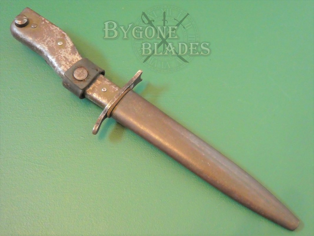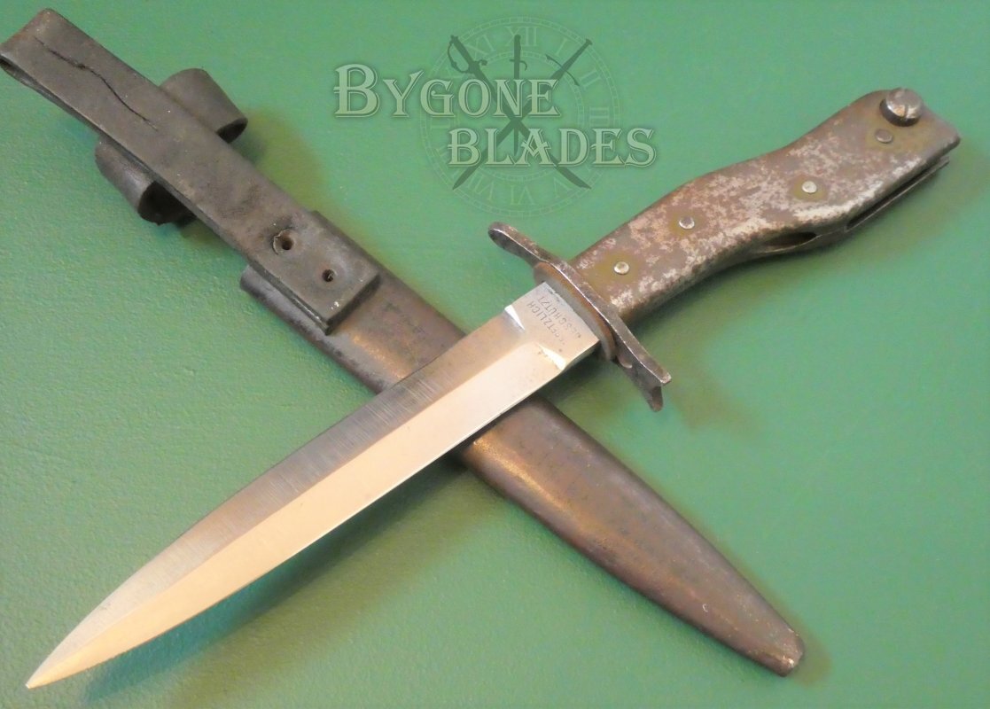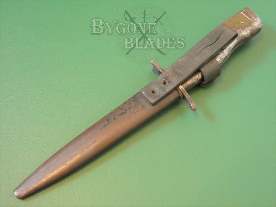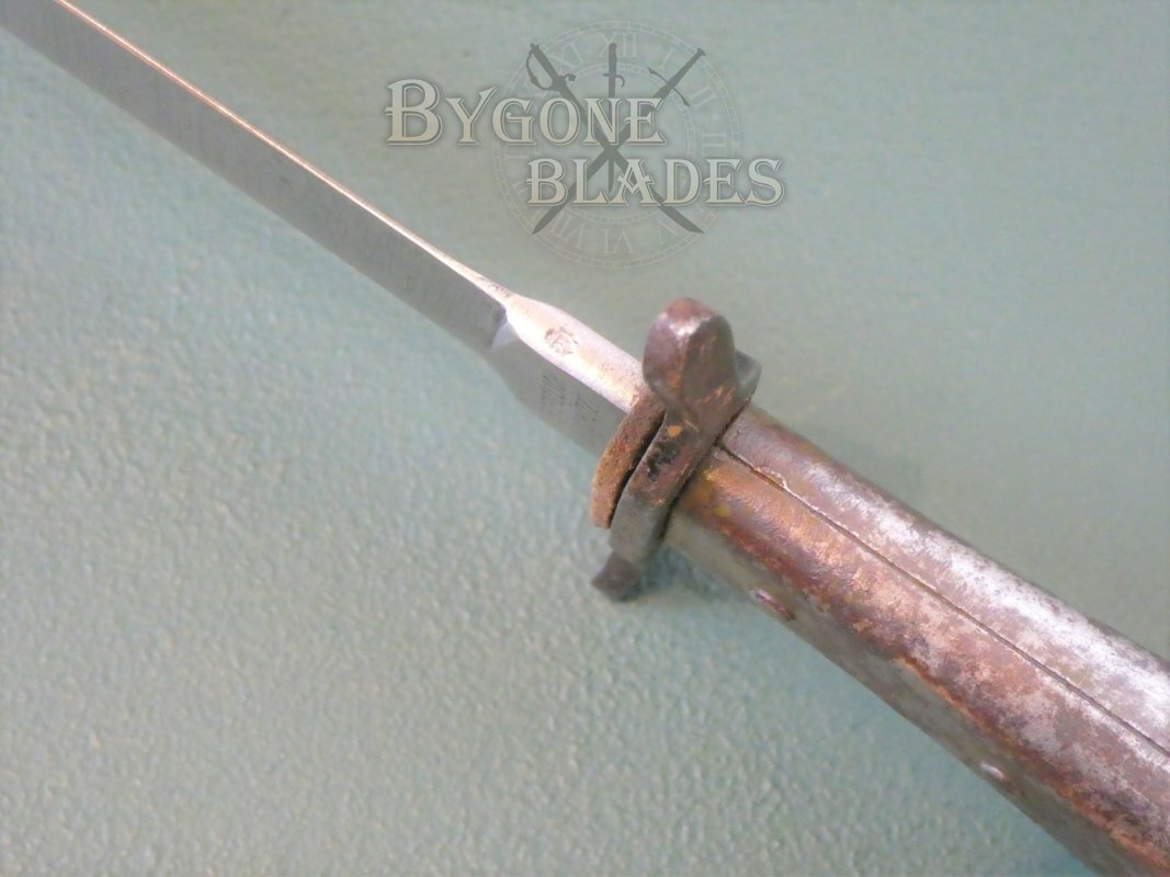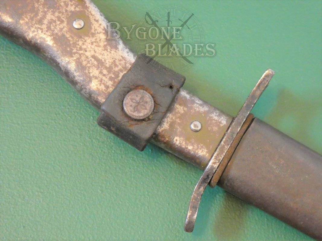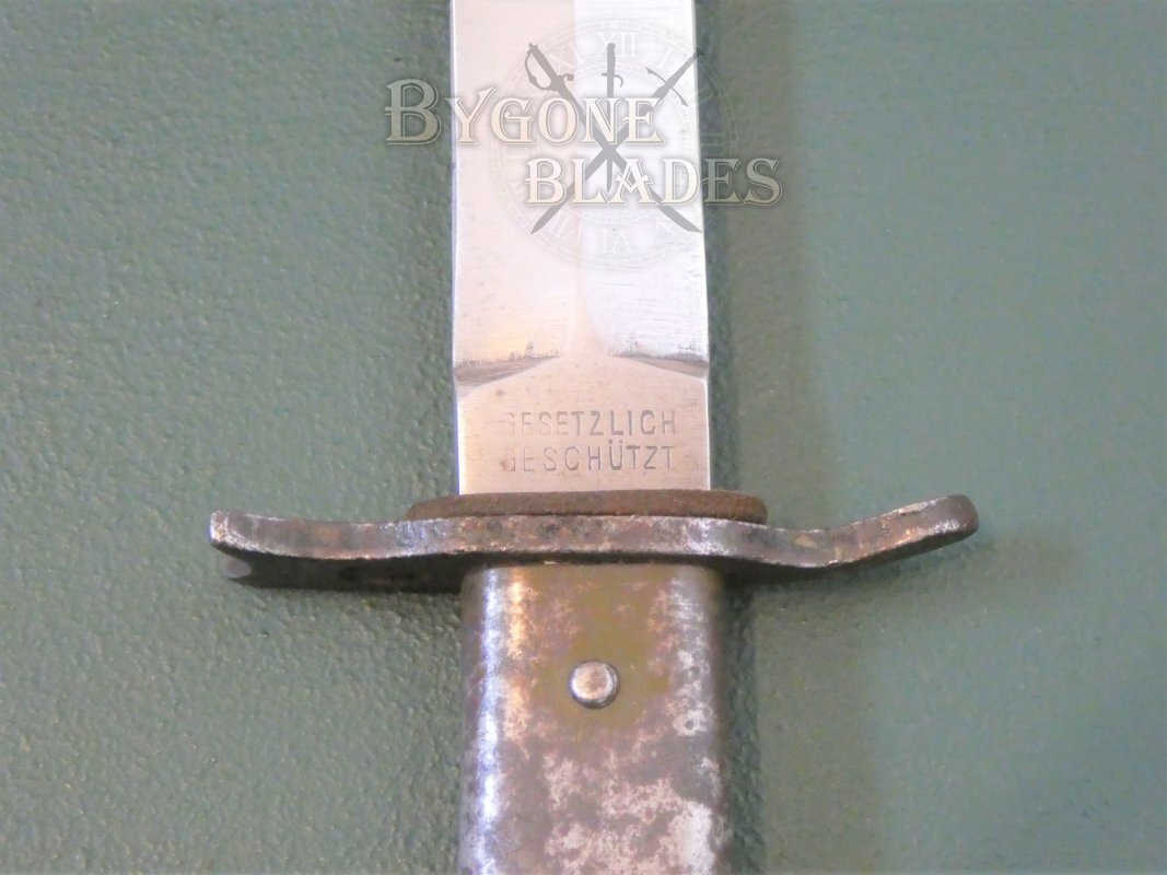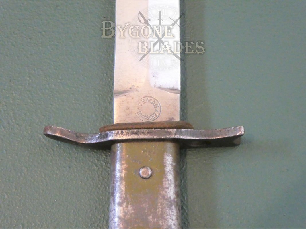 A rare and genuine example of the famous ersatz (EB1) Crank Handle bayonet. This is one of the few ersatz bayonets for which a maker is attributable. Deutsch Maschienenfabrik AG (DEMAG), Duisburg produced these bayonets between 1915 and 1918. The maker’s mark is stamped on every blade. There are four variations of the markings dependent on the period of production. The “Gesetzlich Geschutzt” stamp on the ricasso of this example, and the “DEMAG. Duisburg” circle on the obverse indicate that it is one of the post 1916 production knives.