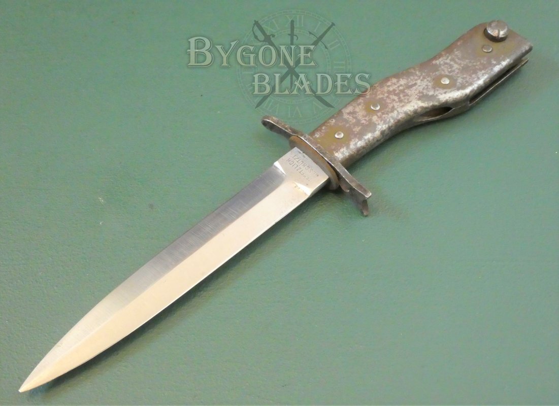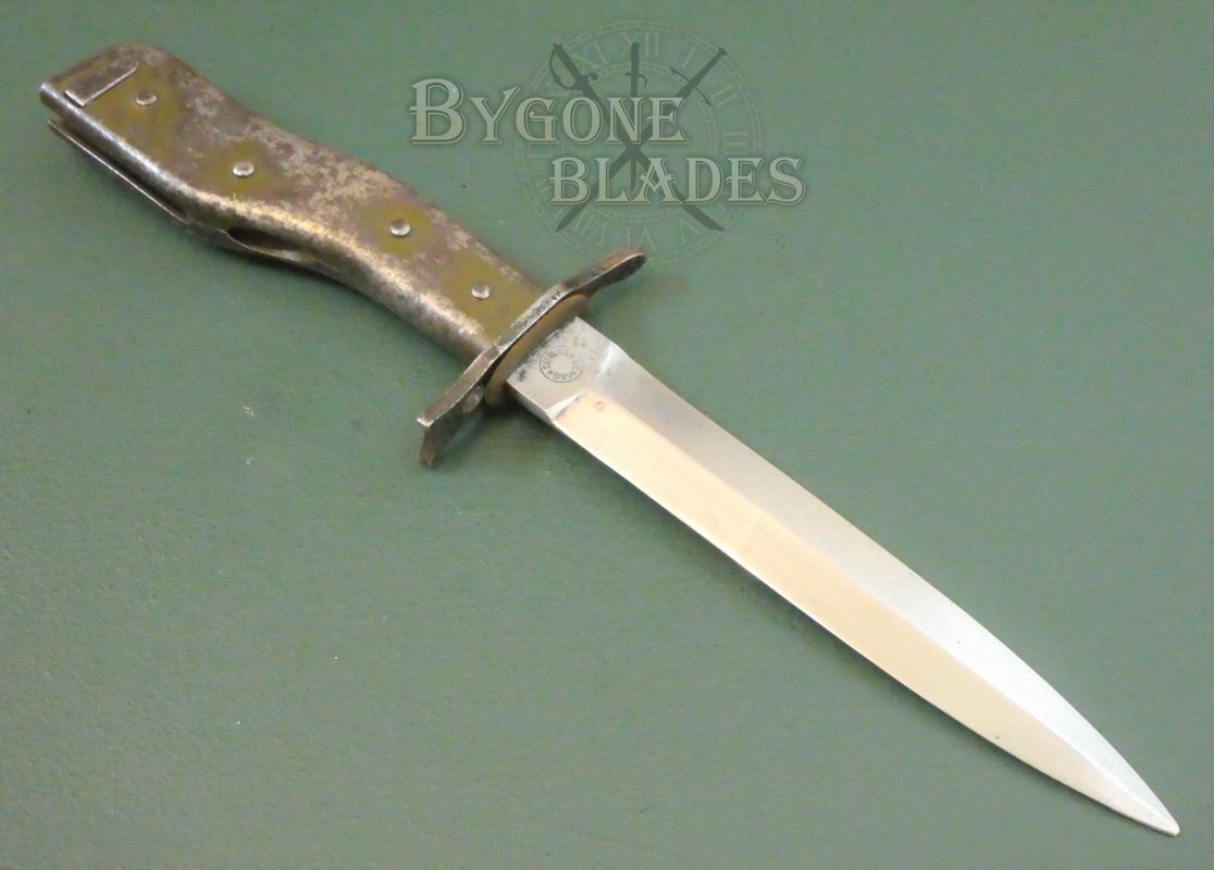NB. There are many fakes of this sought after knife but only the originals have peened rivets in the grip and are marked on the ricasso spine with an inspection stamp. The leather retaining strap – when present, has a “snowflake” style pattern on the press-stud. These are missing on the fakes. There are numerous other differences between the real and fake models, such as blade and crosspiece thickness but the above pointers are easily spotted without the need for callipers.