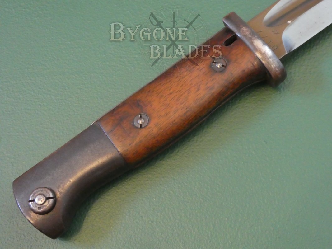 Soon after Hitler’s rise to power, the German war machine started to rearm, in direct contravention of the Treaty of Versailles. In order to keep the identities of the manufacturers’ secret, S-prefix maker codes were used. Between 1934 and 1935 there were twelve private sector manufacturers and each was assigned an S prefix code with the three digit number that followed being unique to each manufacturer. Bayonets produced during this period have walnut grip scales and are of outstanding workmanship. All have waffenamt acceptance stamps on their pommels.
