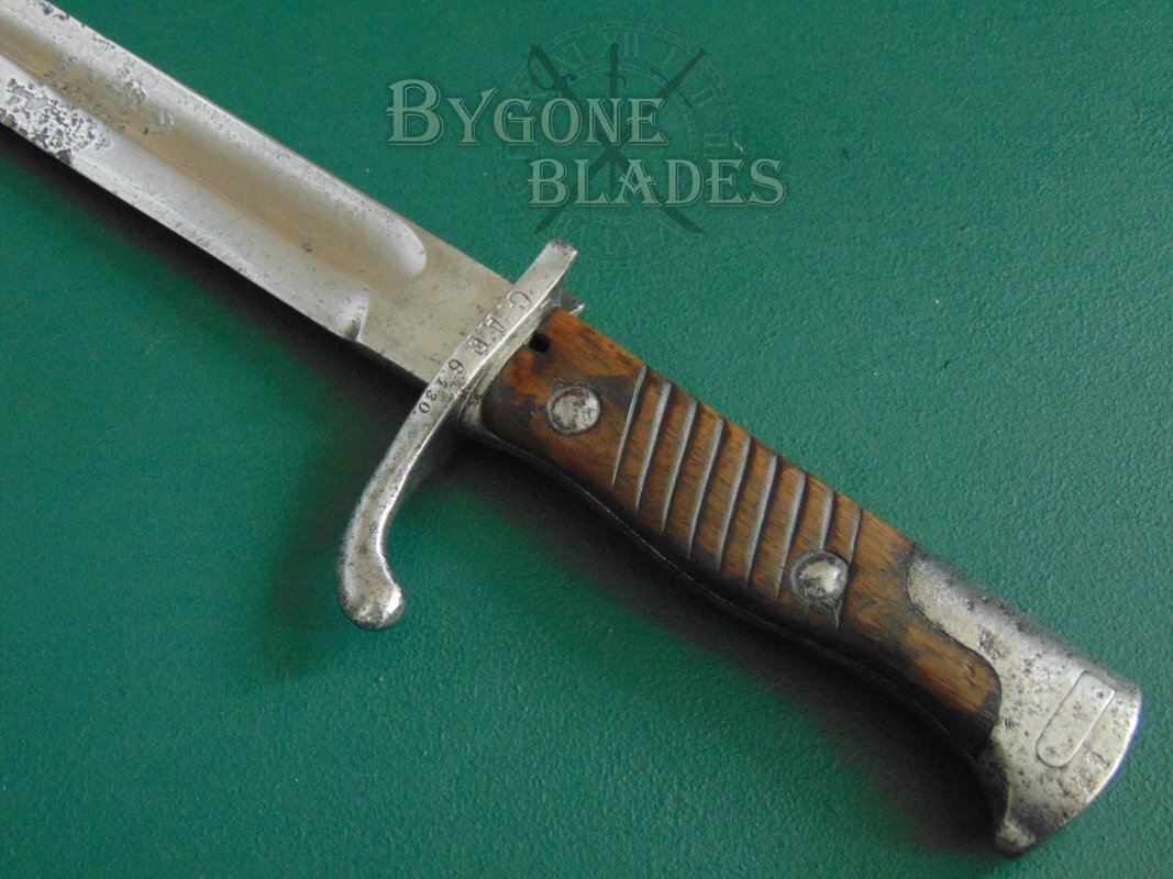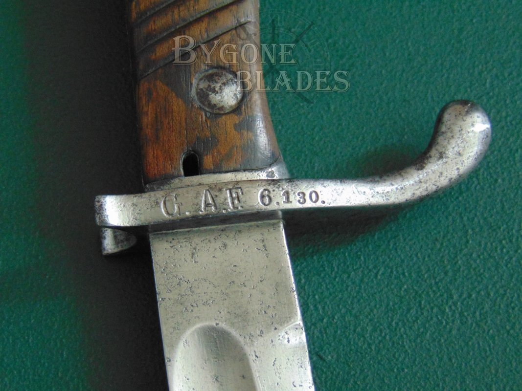 The steel of the hilt has a salt and pepper patina with some light pitting. The steel bears numerous inspection stamps. The screws that hold the wooden scales in place are stamped on both sides, the front of the mortice slot is stamped and the pommel bears two stamps. The press-stud mechanism is also stamped and is in good working order. The long-eared cross-piece bears the unit marking “G. A. F. 6. 130.” I believe this to be a Prussian Guards Foot Artillery regiment but am not totally sure. Prior to 1914, S98/05aA bayonets were only issued to foot artillery and telegraph regiments.