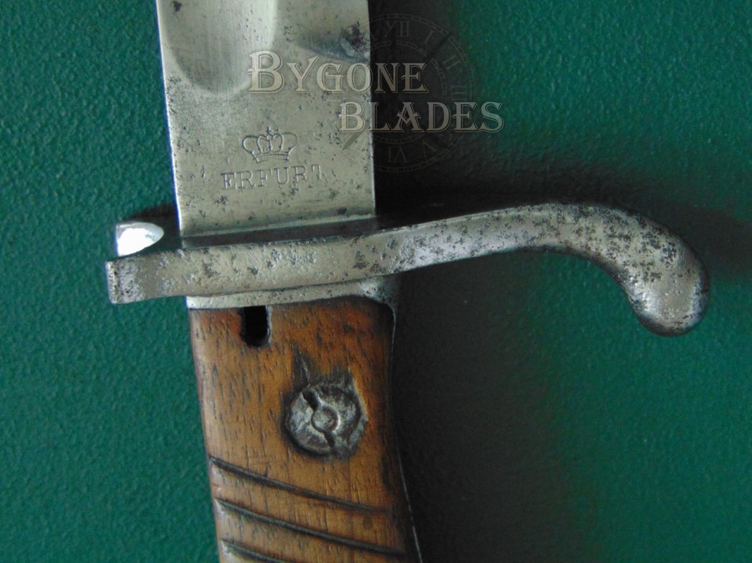The ricasso is stamped with the mark of the Prussian Royal Armoury, a crown above the name “Erfurt.” The spine carries the Royal Cypher of Kaiser Wilhelm II, King of Prussia above the date stamp ’08 (1908) and a crowned acceptance stamp. The blade is in reasonable condition for its 112 years of age and use. There are three areas of pitting on one side which have been cleaned and are now free of rust and are stable. The obverse of the blade is mostly without pitting but there are some small shallow patches along the spine and edge. There are scratches and marks to both sides of the blade consistent with use and field sharpening. The blade is bright and clean with no active rust.