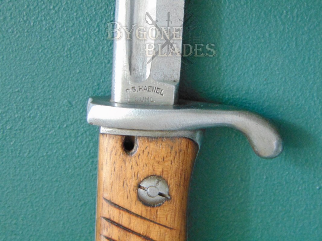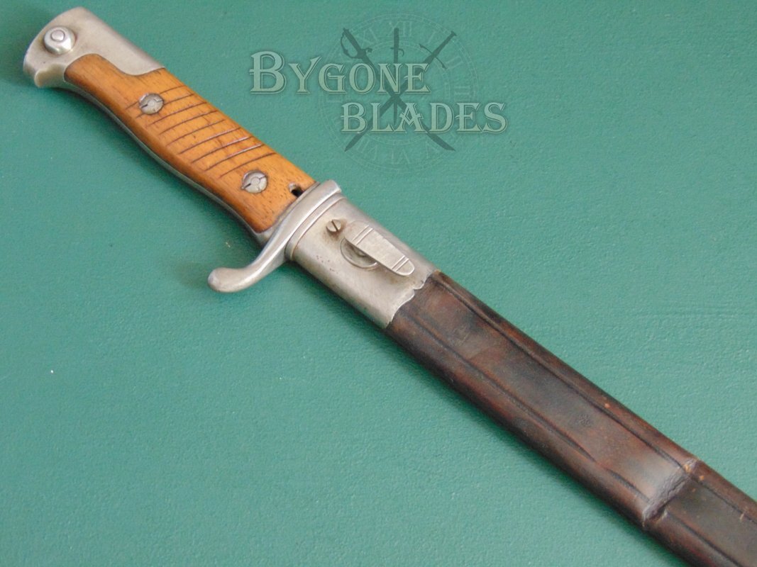 Scarce and excellent example of a Pre-War German model 1898n.A second pattern quill point sword bayonet. The S98 bayonet was produced for use with the Mauser Gewehr 98 rifle using the new and soon to be widely copied bar mounting system.