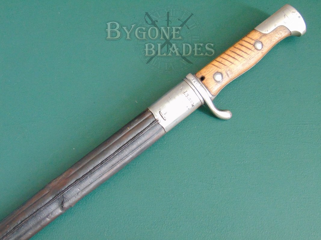 The bayonet is complete with its steel mounted leather scabbard. The leather is in overall good condition and the stitching is intact. There is a crease in the leather and a small split as shown in the photos. The steel locket bears the unit markings for the Prussian 4th Royal Magdeberg Jaeger regiment, 3rd Battalion, weapon number 231. The locket, throat and chape are all marked with inspection stamps. The bayonet sheathes and draws smoothly and is held firmly within the scabbard.