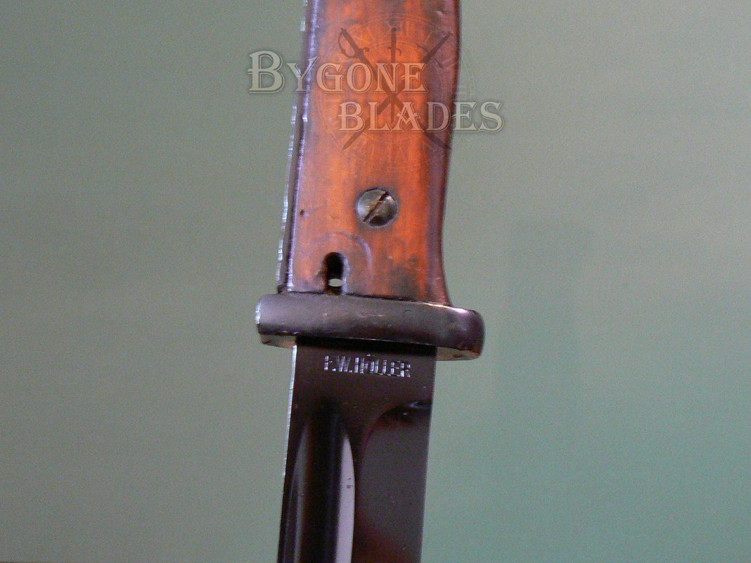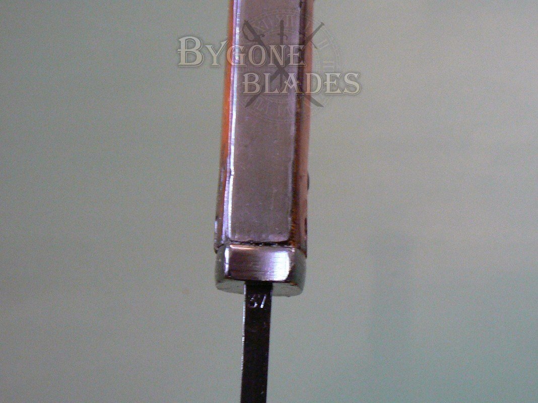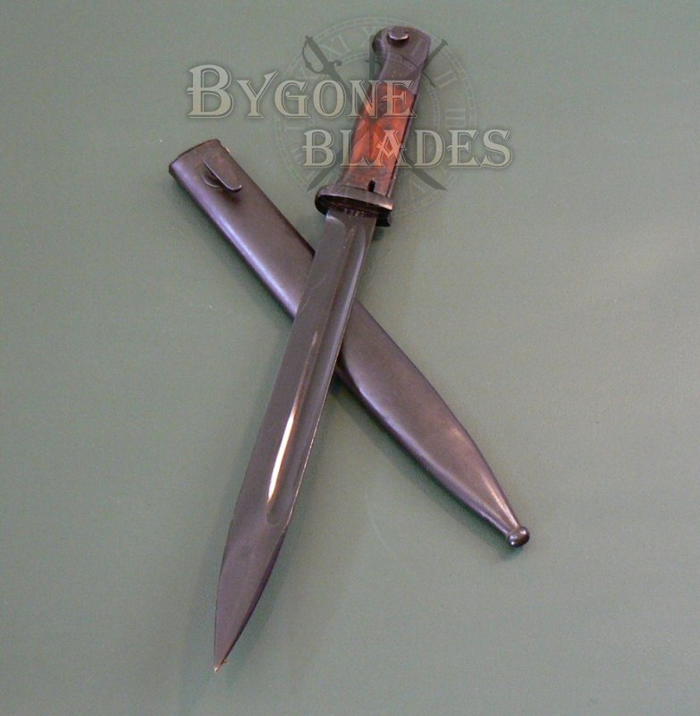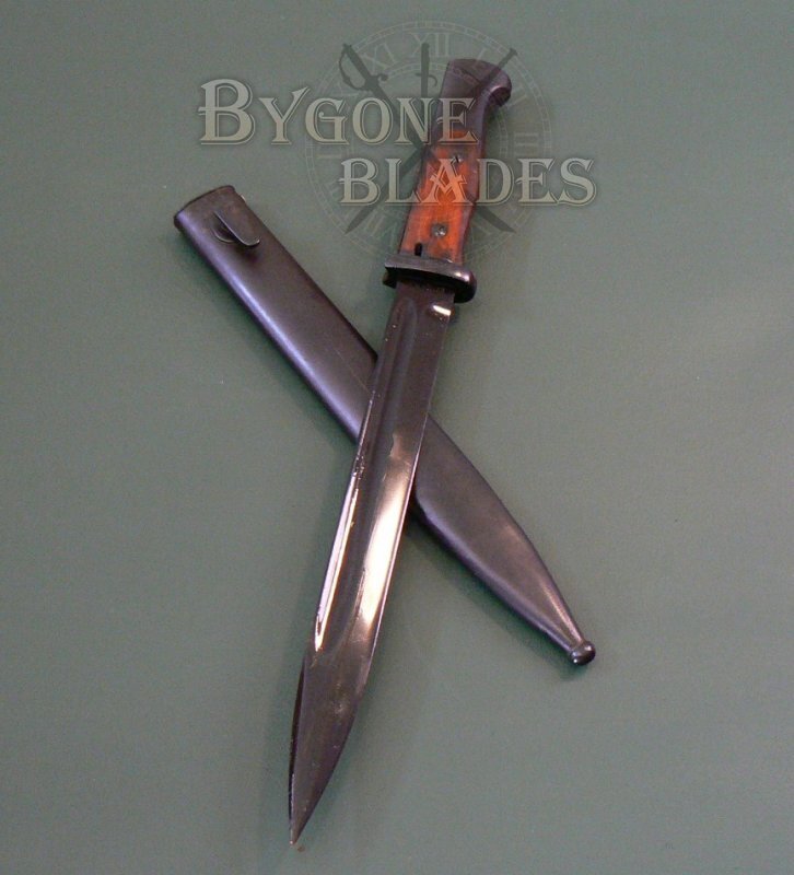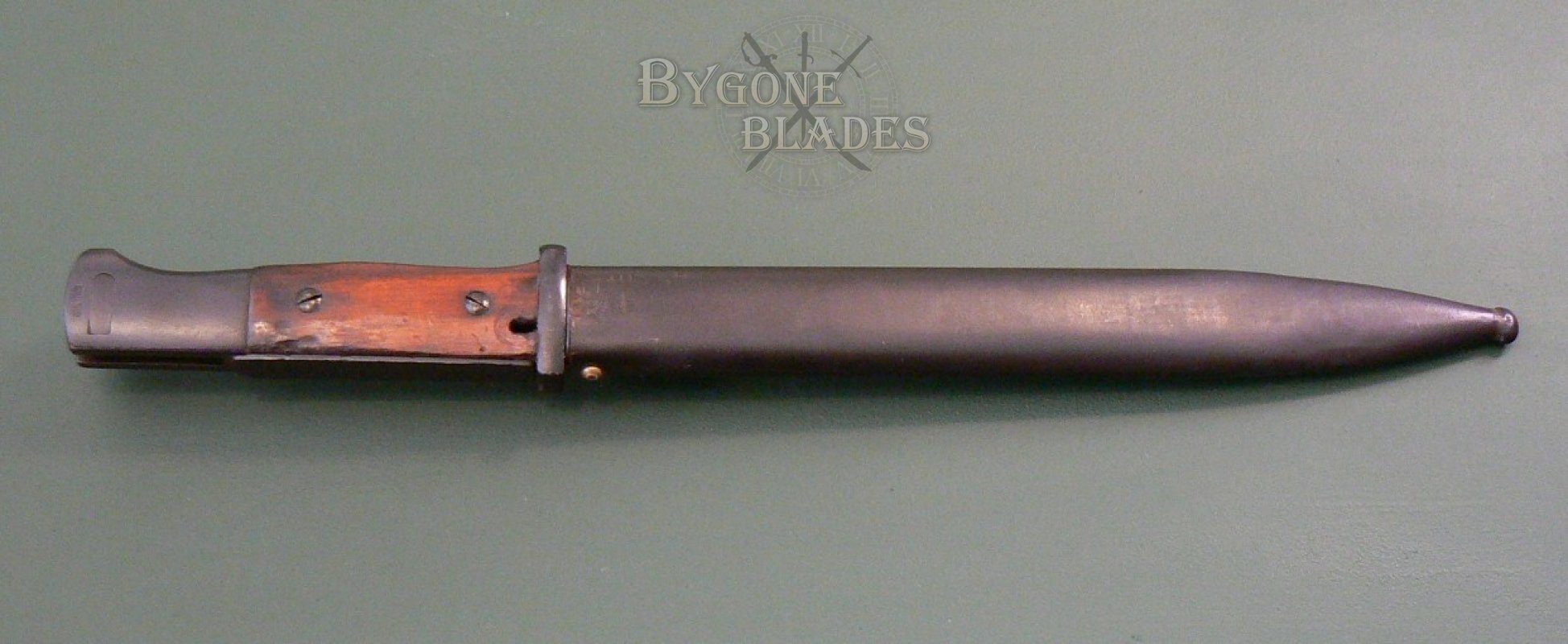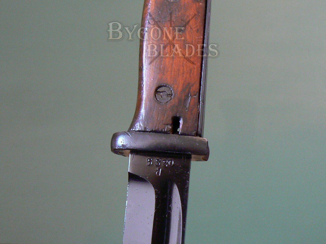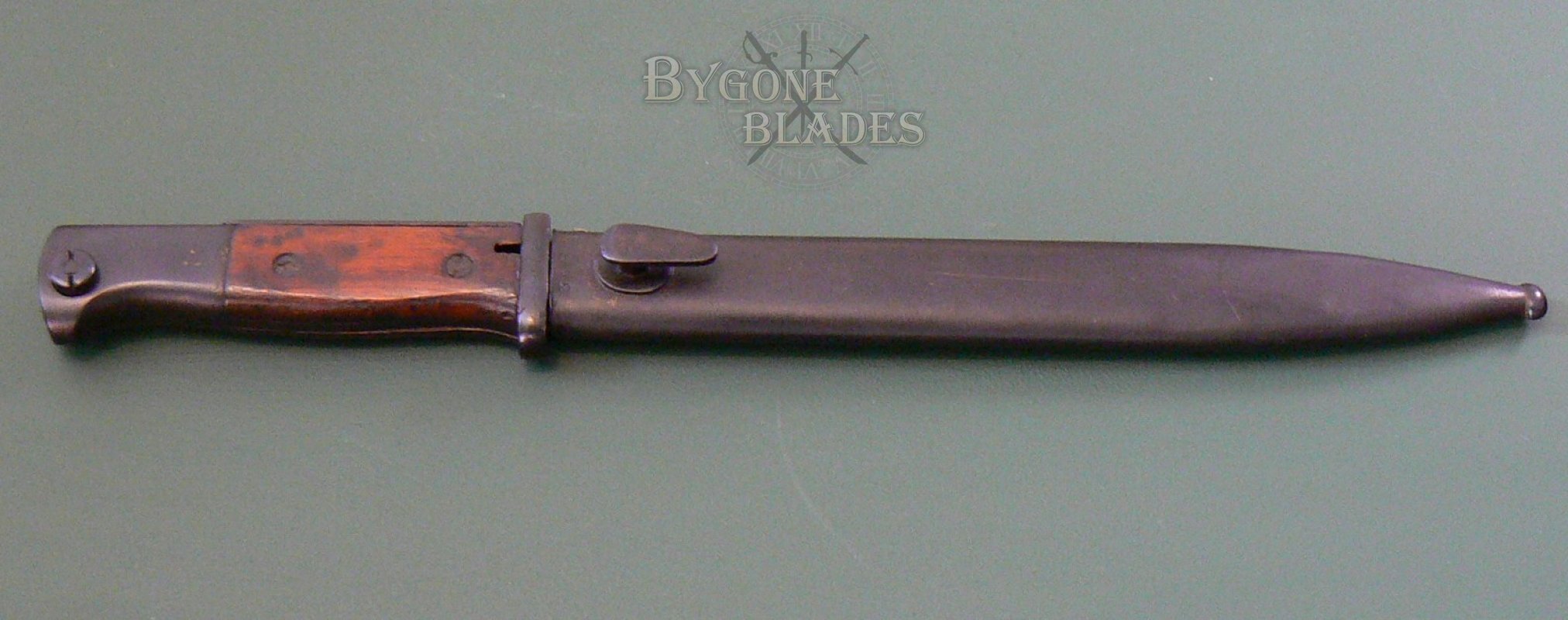 The 251mm single edged blade has a deep single fuller on both sides and is in mint condition retaining all original blued finish. It is stamped on the spine with the date mark “37” for 1937.