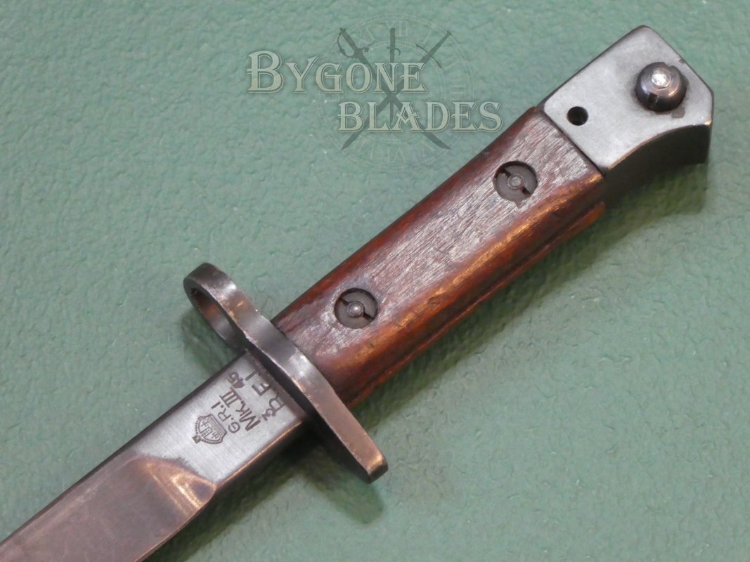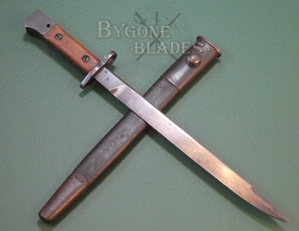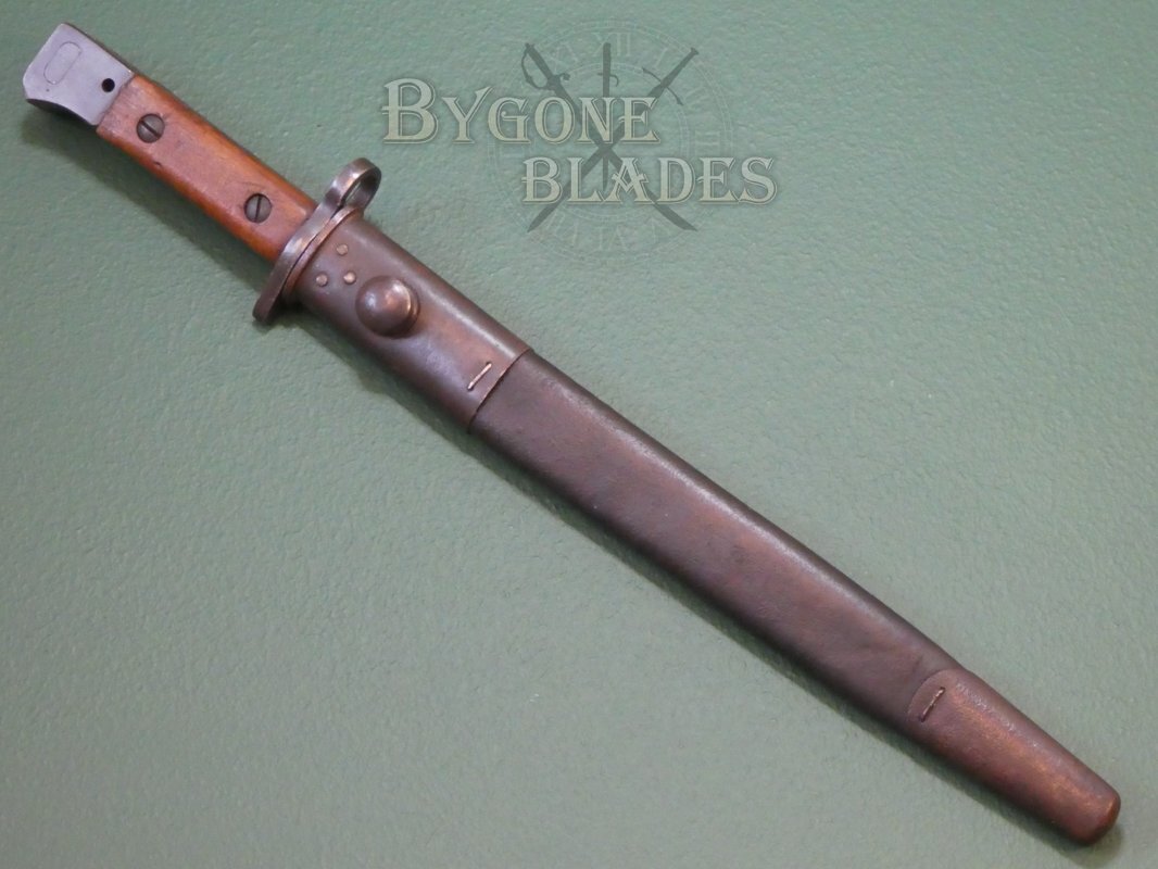 The bayonet is complete with its shortened No.1 leather scabbard with blued steel locket and chape. The scabbard is in good condition. The leather is strong and the stitching is intact. The steel locket and chape retain most of their original blued finish. The chape has some mild pitting. The bayonet sheathes and draws smoothly and is held firmly within the scabbard.